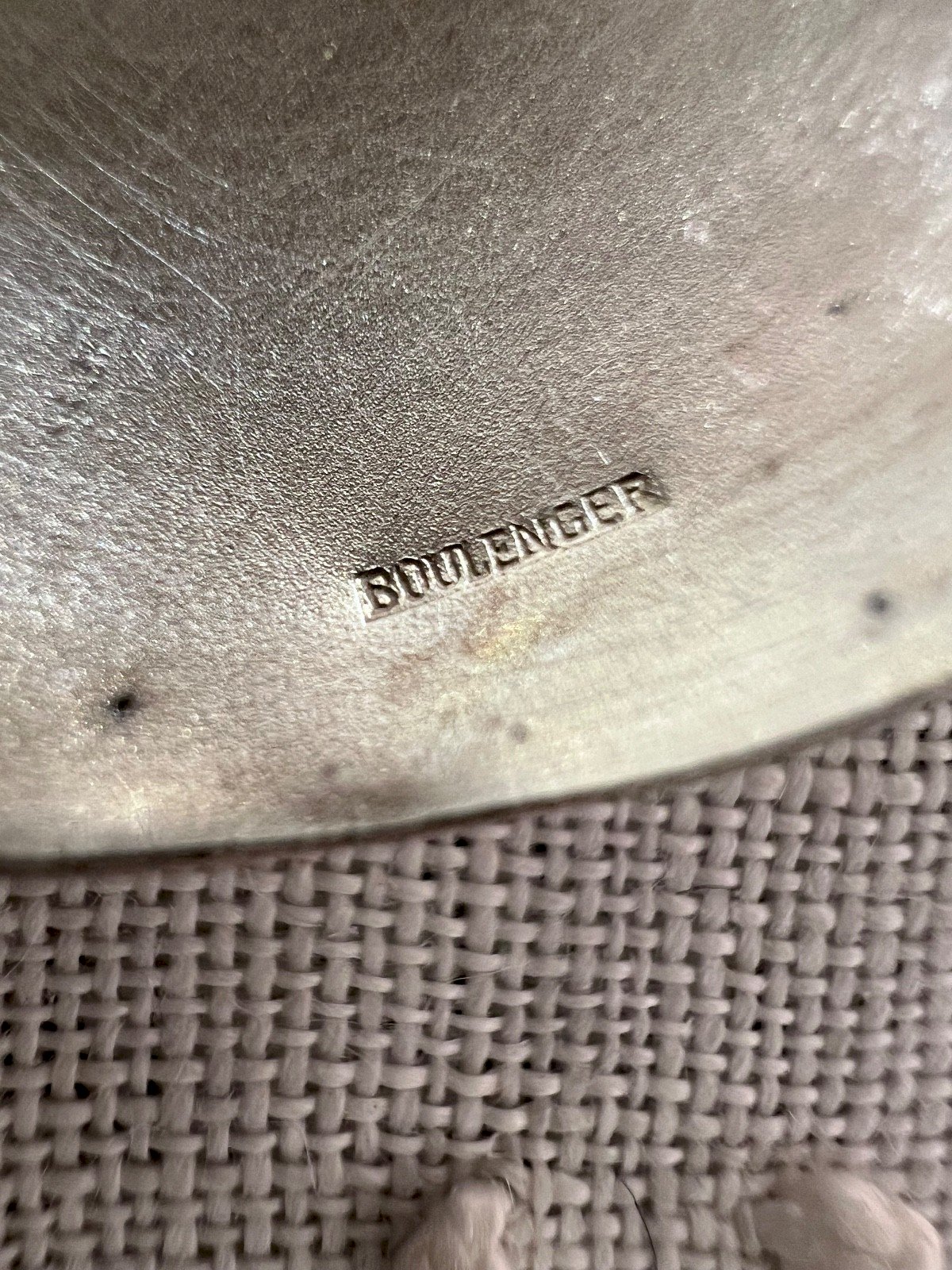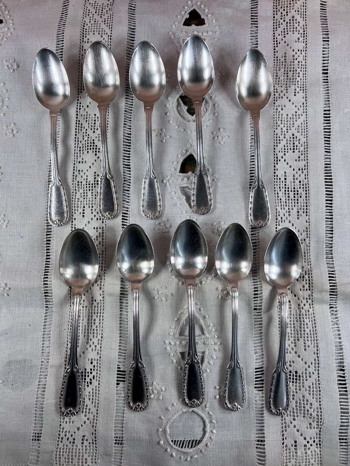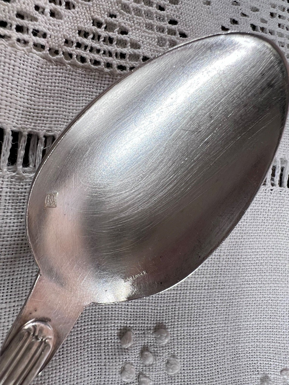 Ensemble de 10 petites cuillères anciennes en métal argenté , réalisées par la prestigieuse maison Boulenger , grande référence de l’orfèvrerie française de la fin du XIXᵉ et du début du XXᵉ siècle. Chaque cuillère présente une ligne élégante et équilibrée , avec un décor finement ciselé sur le manche, typique du savoir-faire parisien. Le monogramme gravé apporte une touche d’intimité et de noblesse, évoquant une ancienne table de famille, des goûters feutrés, des moments suspendus. Ces cuillères sont idéales pour le dessert, le café, le thé ou les entremets, et trouvent naturellement leur place sur une table raffinée ou dans une collection d’orfèvrerie. Caractéristiques Maison : Boulenger Métal : métal argenté Nombre de pièces : 10 Longueur : 14 cm (≈ 5.5 inches) Décor : classique élégant, bordure travaillée Monogramme : présent sur chaque pièce État Bel état d’usage ancien. Légères micro-rayures et patine douce liées au temps, sans déformation ni accident. Argenture bien présente, ensemble harmonieux. Type:Art de la table, Cuisine Origine:France Sous-type:Cuillère Pays d'origine:France Matière:Métal argenté