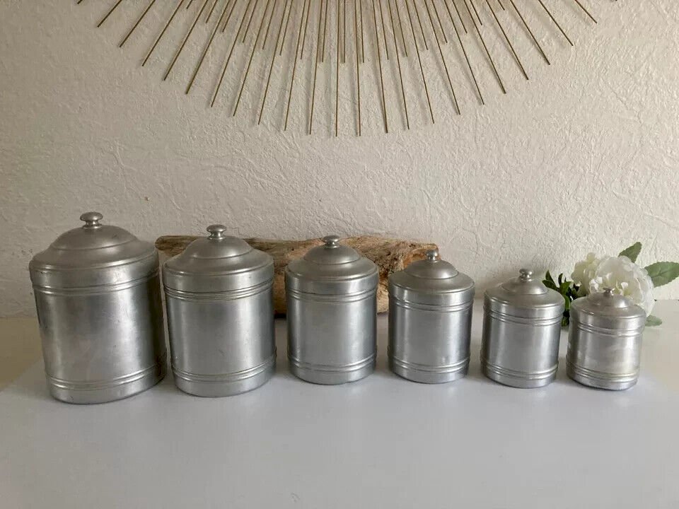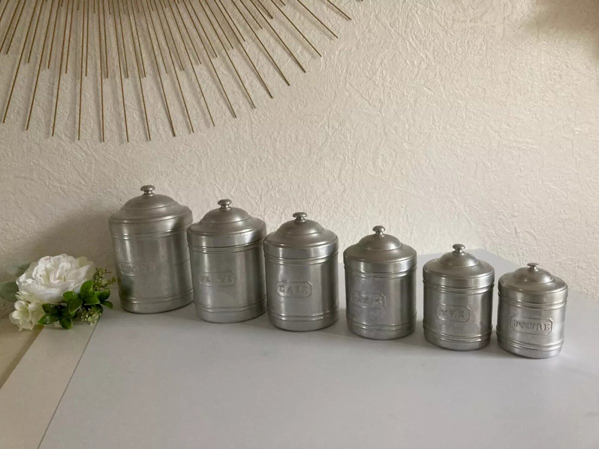 ♥ Ancienne Série Complète de 6 Pots à Épices en Aluminium Vintage ♥ Hauteur la plus grande Sucre 19 Cm La plus petite Poivre 10,5 Cm État:Occasion: Objet ayant été utilisé. Consulter la description du vendeur pour avoir plus de détails ...Occasion: Objet ayant été utilisé. les éventuelles imperfections. Pays d'origine:France Type:Pot Sous-type:Pot à épices Matière:Aluminium