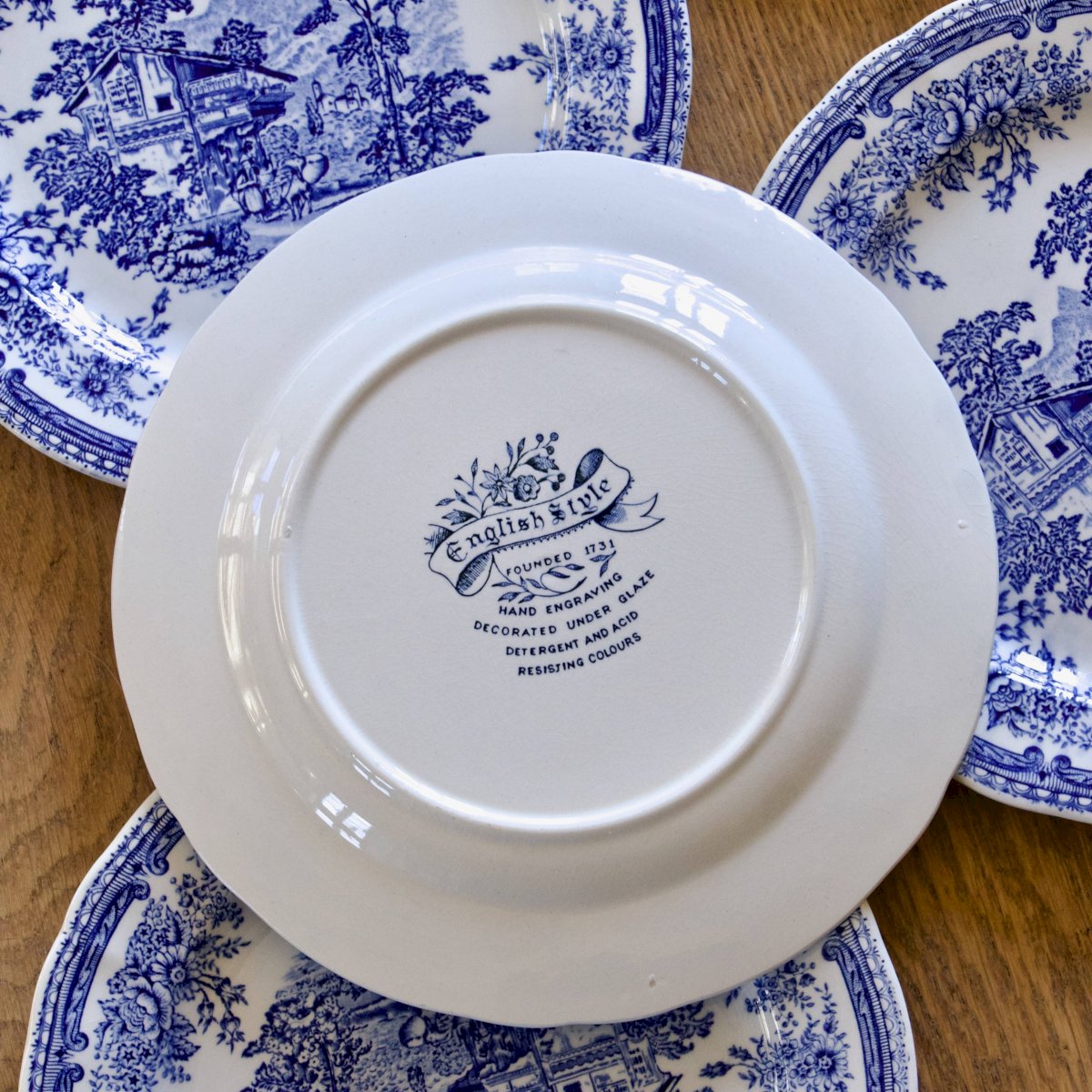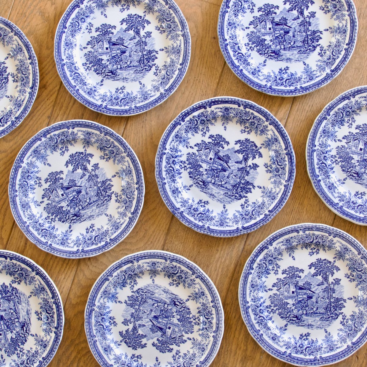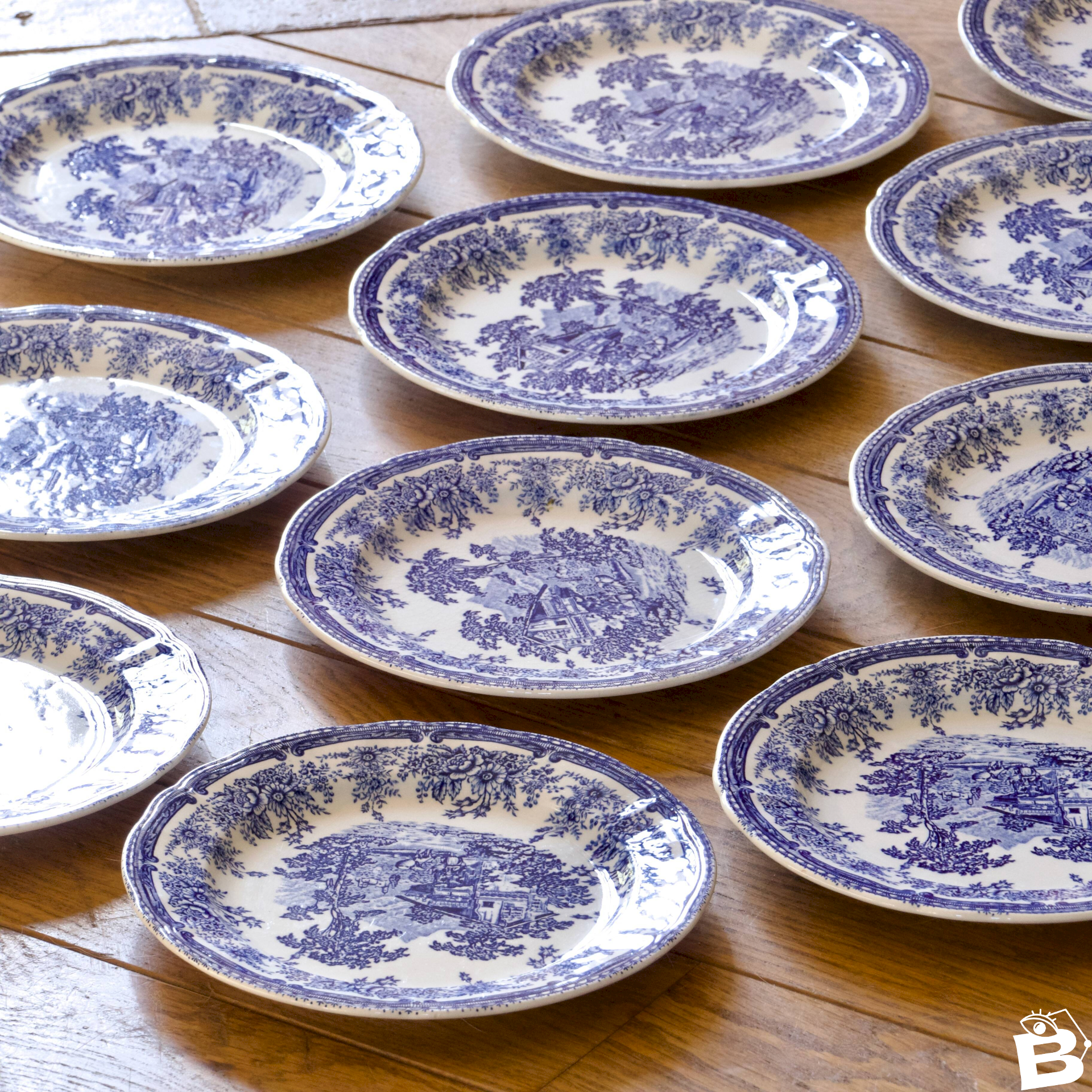 Ensemble de 11 jolies assiettes à entrée et/ou à dessert anciennes en faïence estampillées Luneville collection “English Style”.Joli et riche décor champêtre bleu profond.Marli en frise néoclassique et rebord végétal aux fleurs élégantes.Faïence bien épaisse.En très bon état.Nous disposons du service complet (assiettes plates, creuses, à dessert, service à café et différents grands plats), voir nos autres annonces ou nous écrire si intéressé par un lot.? 20 cm de diamètre.✨ Envoi très soigné.✨ Nous avons d'autres annonces en ligne, n'hésitez pas à jeter un coup d'oeil !10/25.