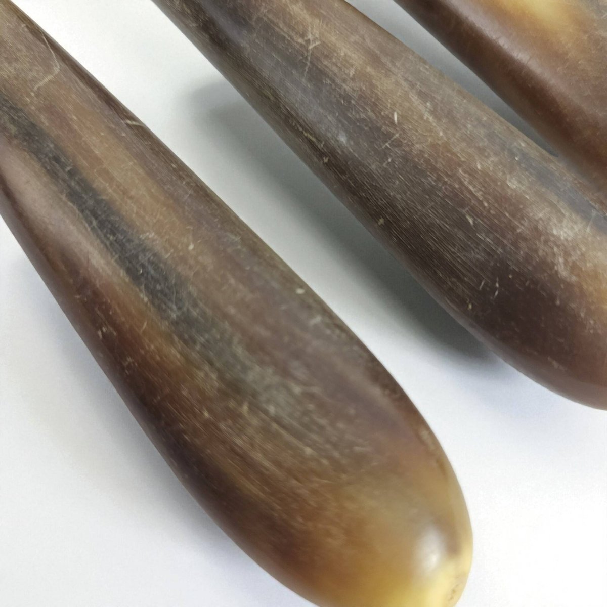 Il s'agit bien de manches en corne.L'ensemble est en bon état avec quelques traces du temps sur les lames en acier.La série de 12 couteaux à fromage / dessert est également en vente sur ma boutique SelencyLongueur 24,4 cm.Largeur lame max 2,3 cm.Emballage soigné et livraison rapide.