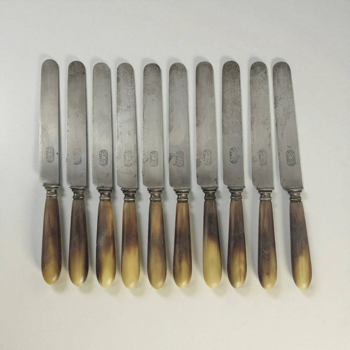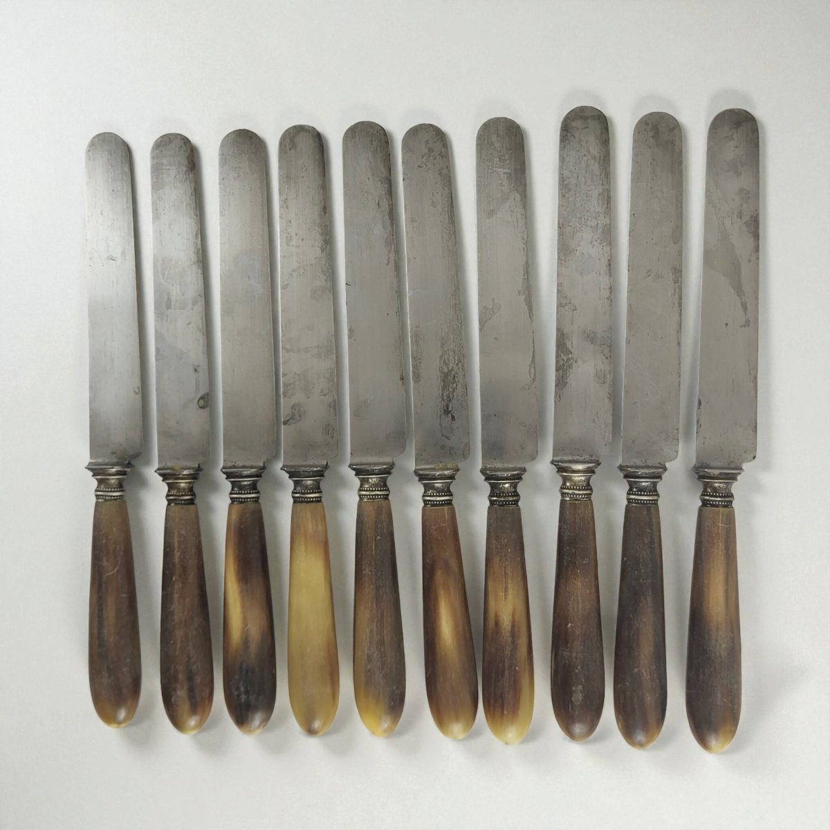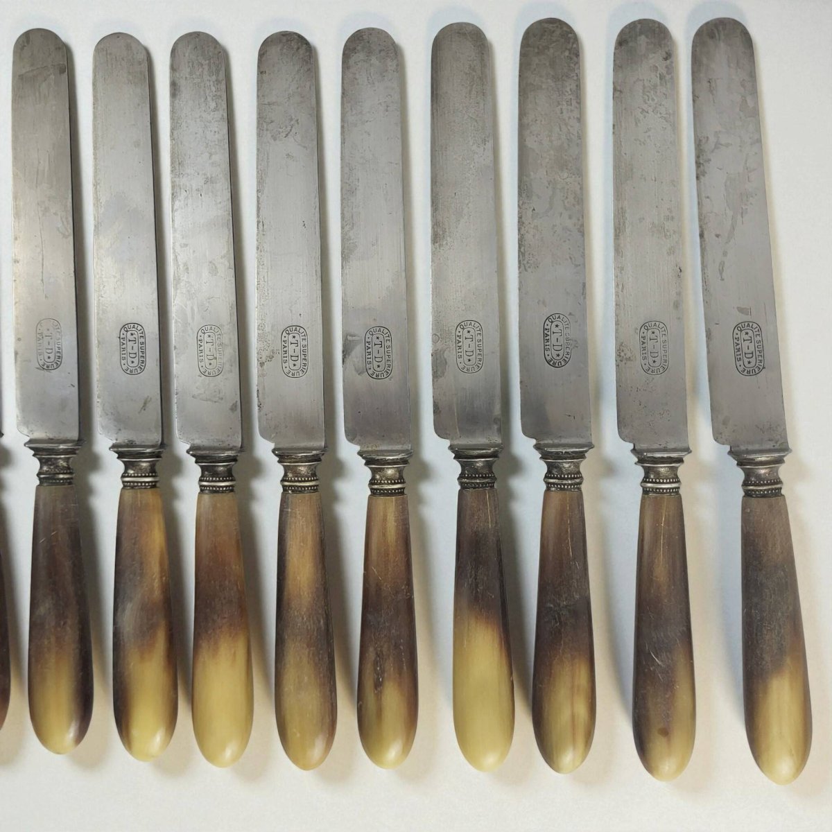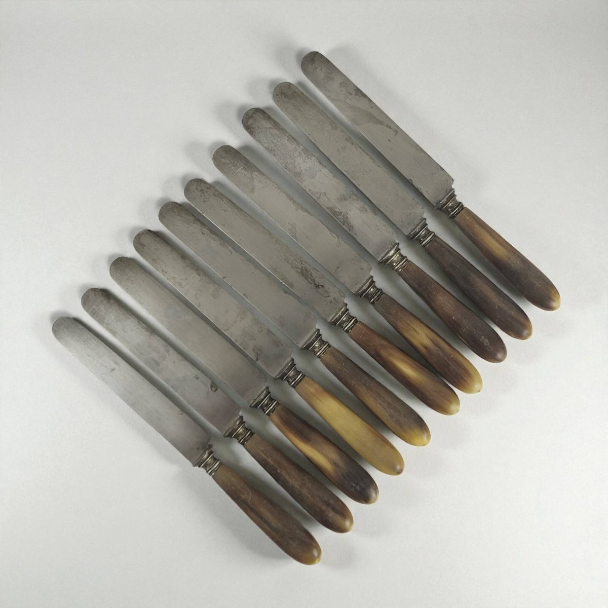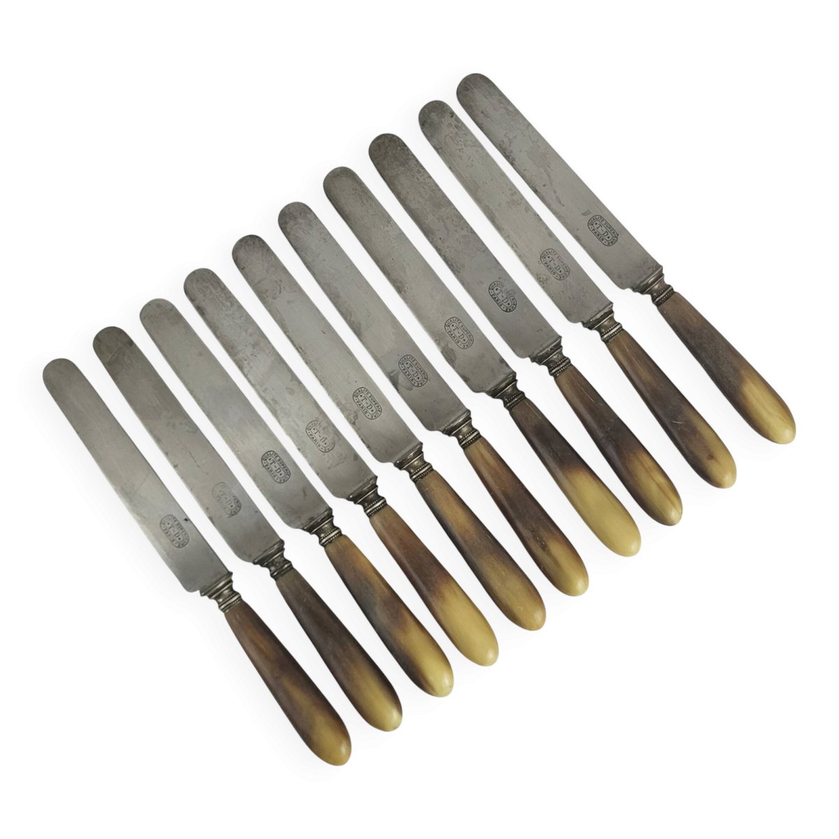12 COUTEAUX DE TABLE MANCHE CORNE VIROLE ARGENT ART DÉCO