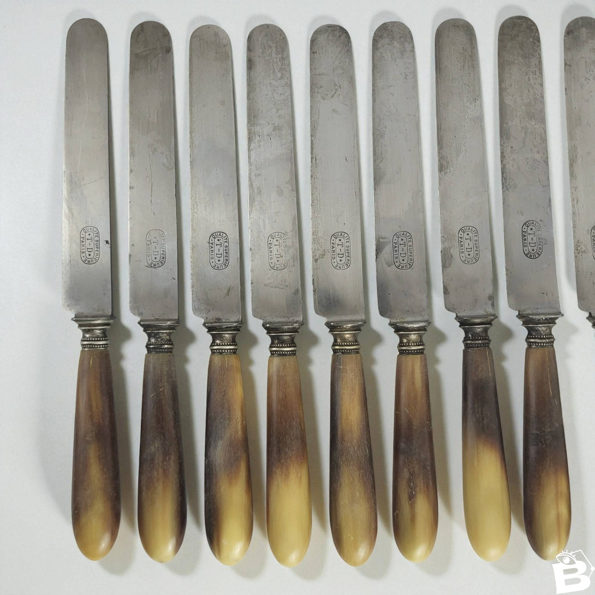 Ensemble de 11 couteaux manche corne et lame en acier, de marque T-D Paris.Bague en métal argenté.