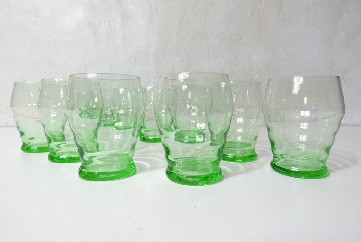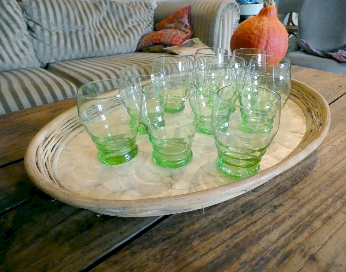 11 verres à eau, en verre soufflé, années 50. Vert, couleur dans la masse. Verres: H.9,5 cm. D.7 cm. Contenance 150 ml. Ils sont en excellent état. Emballage sécurisé promis. État:OccasionObjet ayant été utilisé. Objet présentant quelques marques d'usure superficielle, entièrement opérationnel et fonctionnant correctement. Il peut s'agir d'un modèle de démonstration ou d'un objet retourné en magasin après une courte période d'utilisation. les éventuelles imperfections. Couleur:Vert Type:Verre Contenance:150 ml Matériau:Verre Type de verrerie:Verre à boire