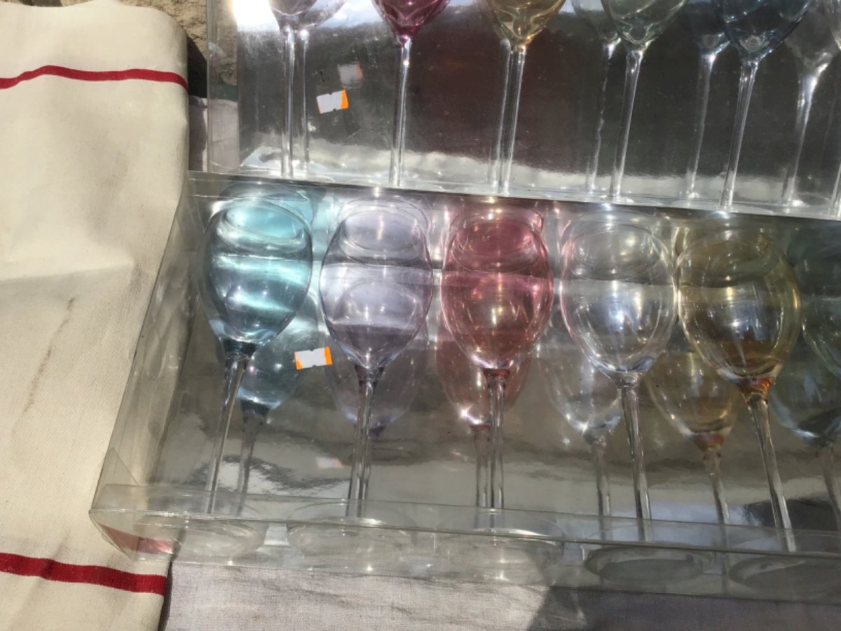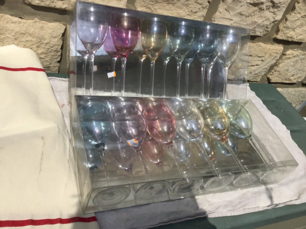 Très bon état général. Dans coffrets d’origine  Hauteur 22cm  Coffret d'origine car pas servi. Voir photos. Couleur différentes. Marque:verres a pied Type:Arts de la table, Cuisine Période:Contemporain Origine:France Sous-type:Verre Matière:Verre Style:années 70/80