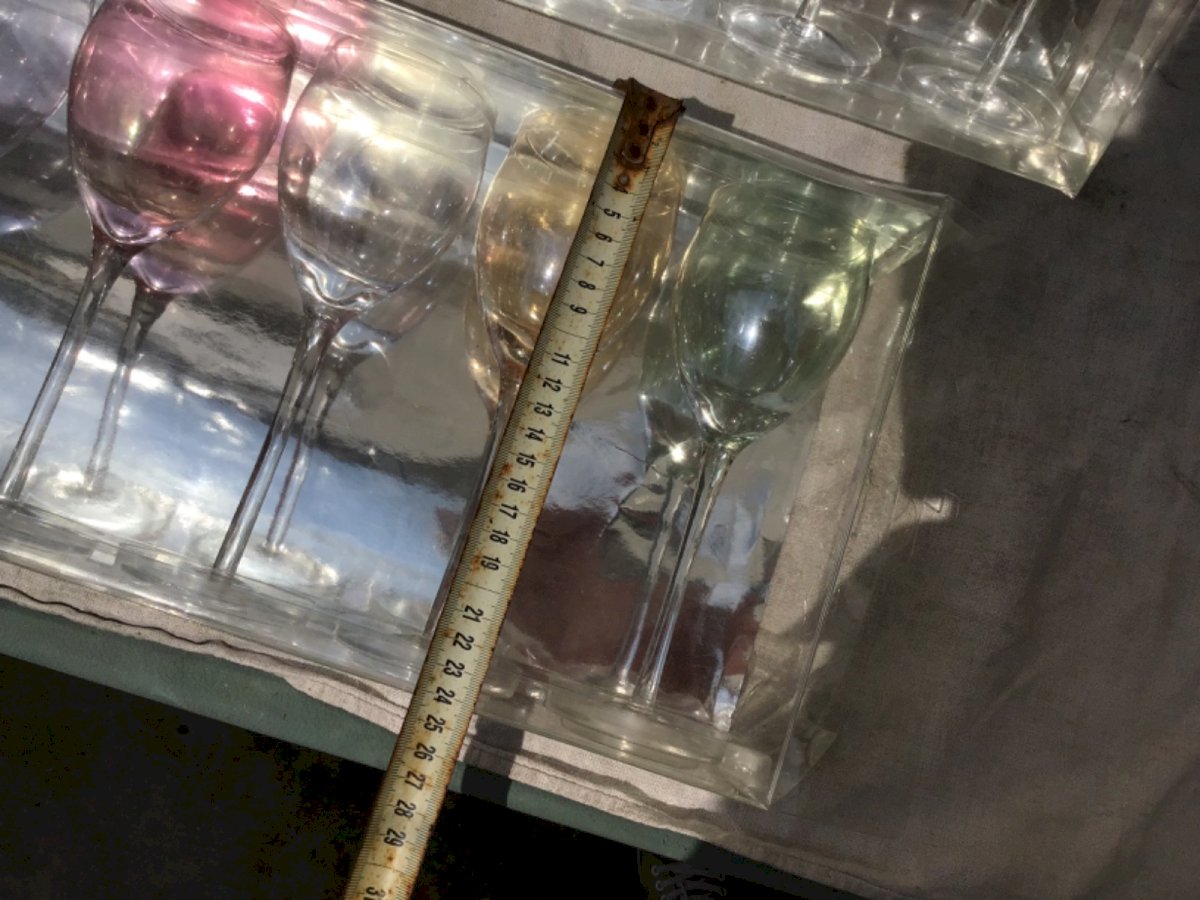 12 ANCIENS VERRES À PIED VERRES À VIN COULEURS DIFFÉRENTES VINTAGE ht 22cm