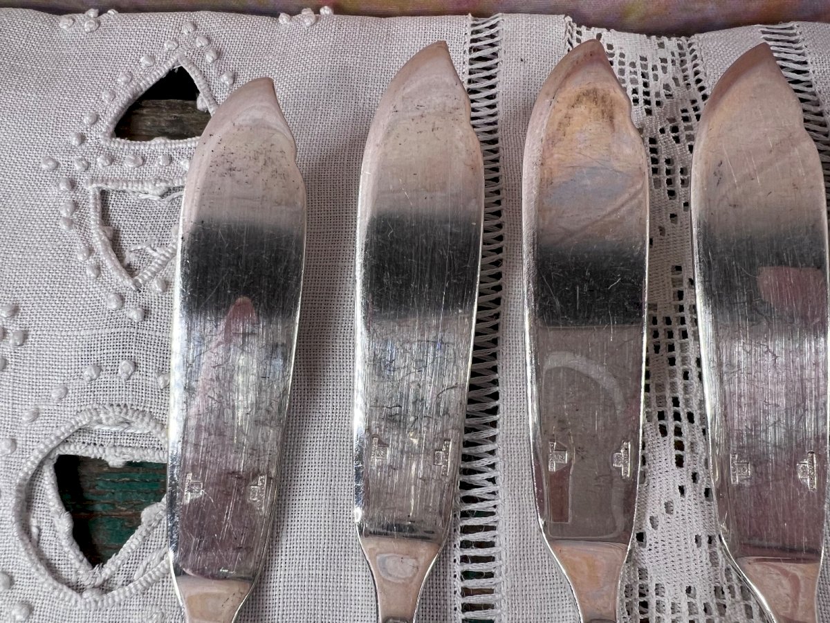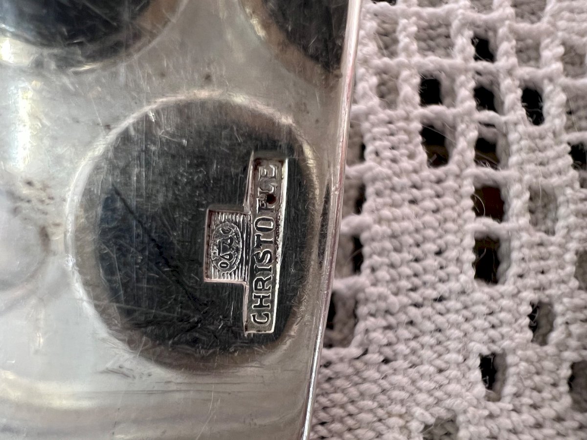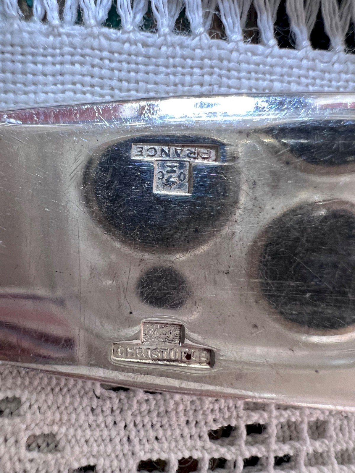 Ensemble de 12 couteaux à poissons anciens de la prestigieuse maison Christofle , emblématique de l’art de la table français. Ces couteaux se distinguent par : leur lame large et effilée , typique des couteaux à poissons un équilibre élégant en main un monogramme finement gravé (lettre “S”), témoignage d’un service personnalisé, autrefois destiné à une belle table familiale ou bourgeoise Le revers porte les poinçons Christofle “FRANCE – 3C” , attestant d’une production en métal argenté de haute qualité . L’ensemble présente une patine authentique , avec micro-rayures d’usage et légères traces du temps, sans choc ni déformation — une usure sincère, qui raconte les repas et les saisons passées. Dimensions Longueur : 19,5 cm (≈ 7.68 inches ) Type:Arts de la table, Cuisine Marque:Christofle Origine:France Période:Art Déco Sous-type:Couteau Pays d'origine:France Matière:Métal argenté