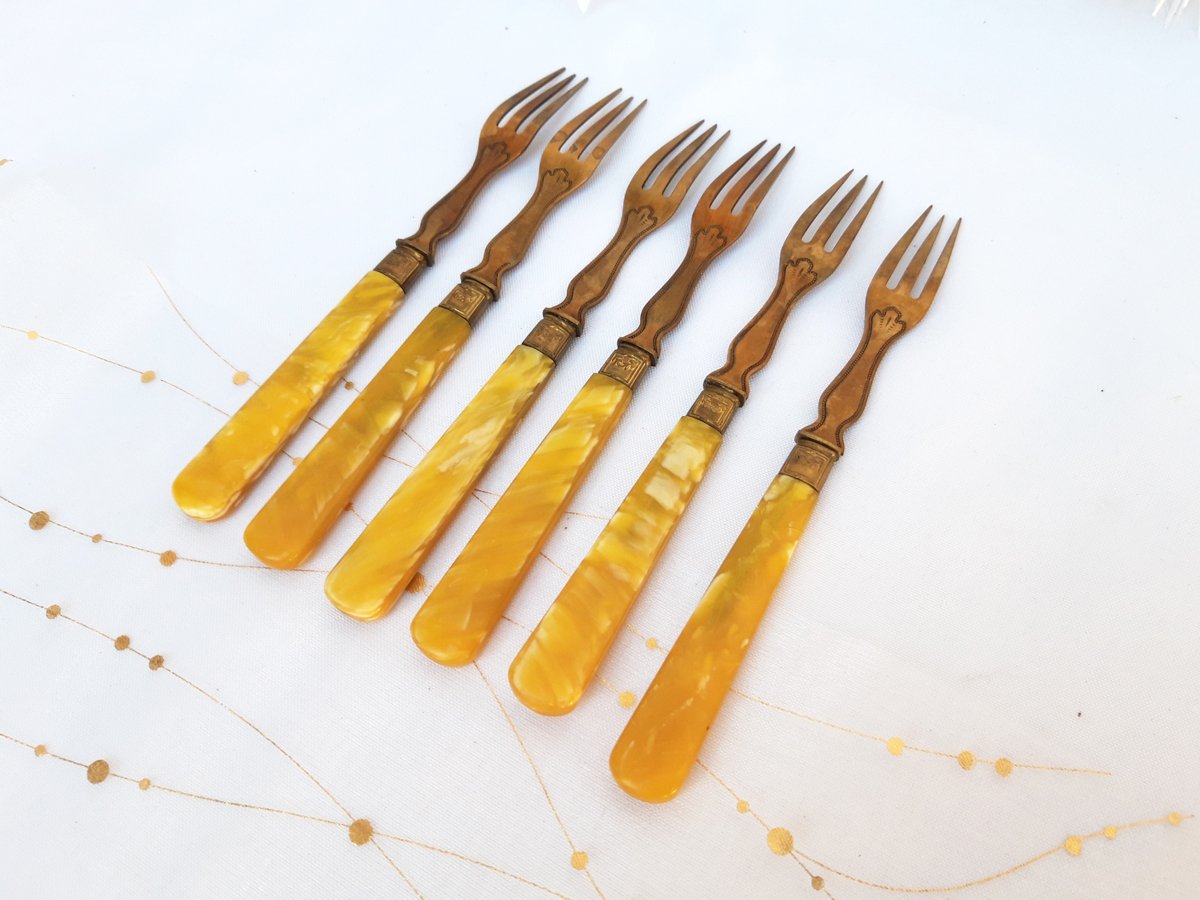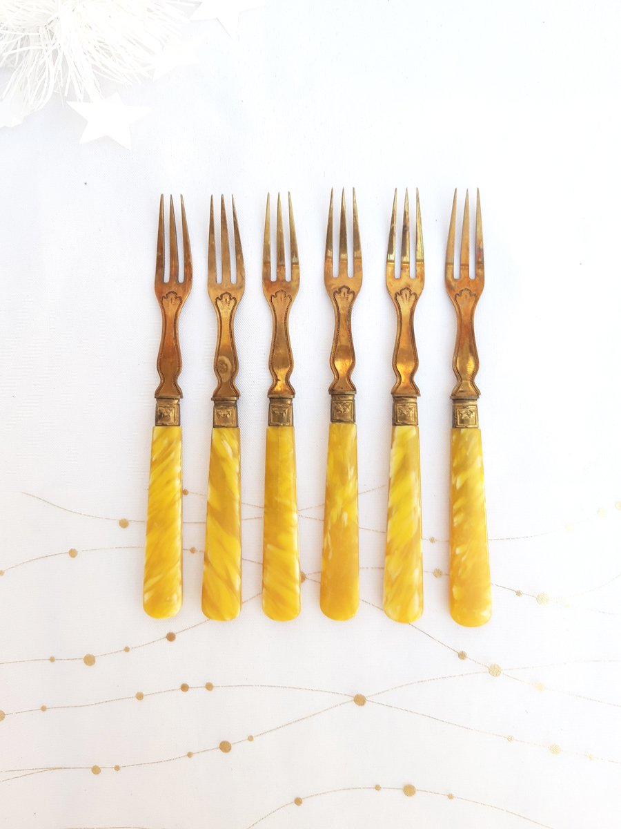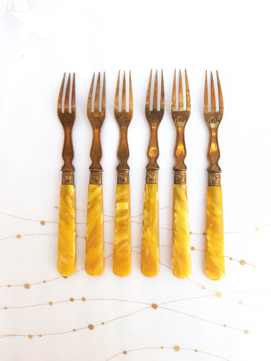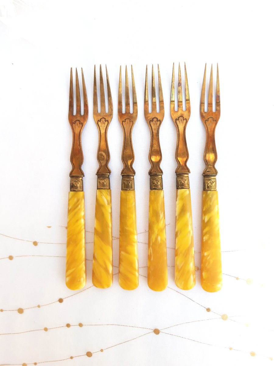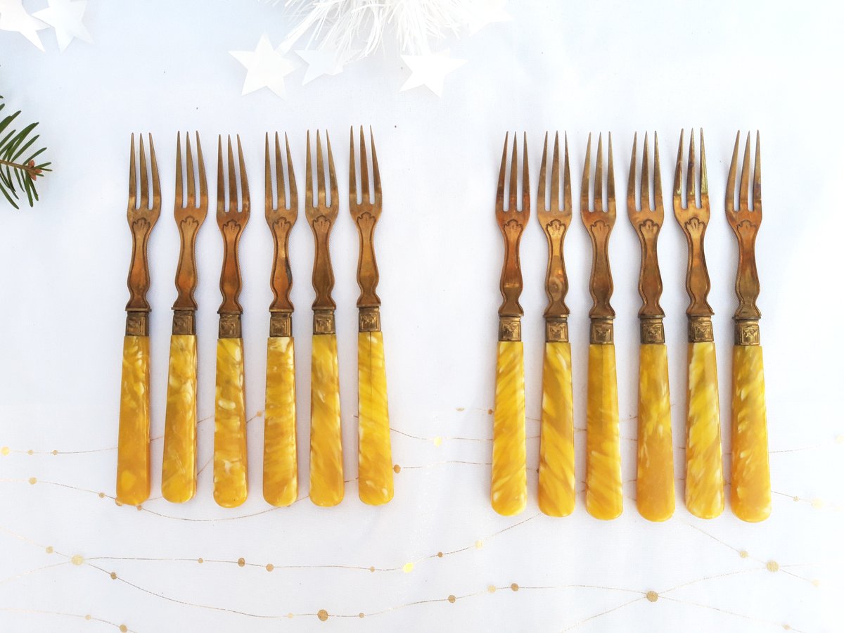 12 fourchettes à crustacés anciennes 1910 Doré/Jaune Bakélite/Laiton