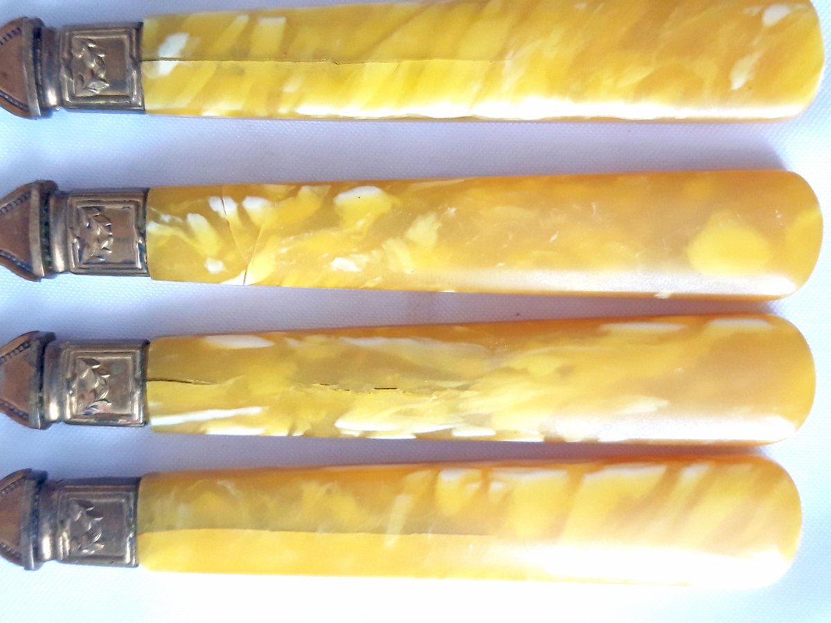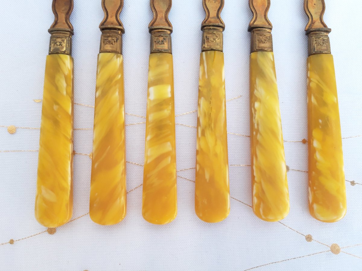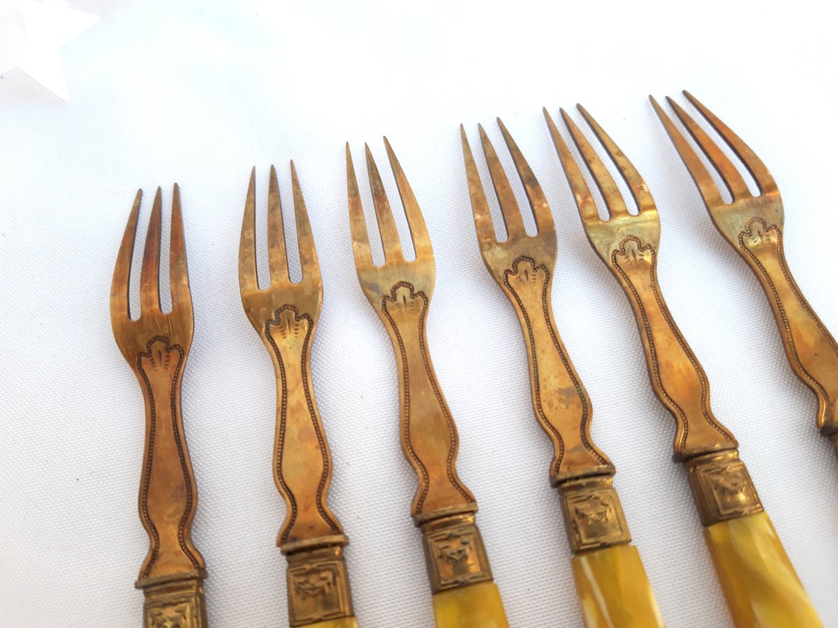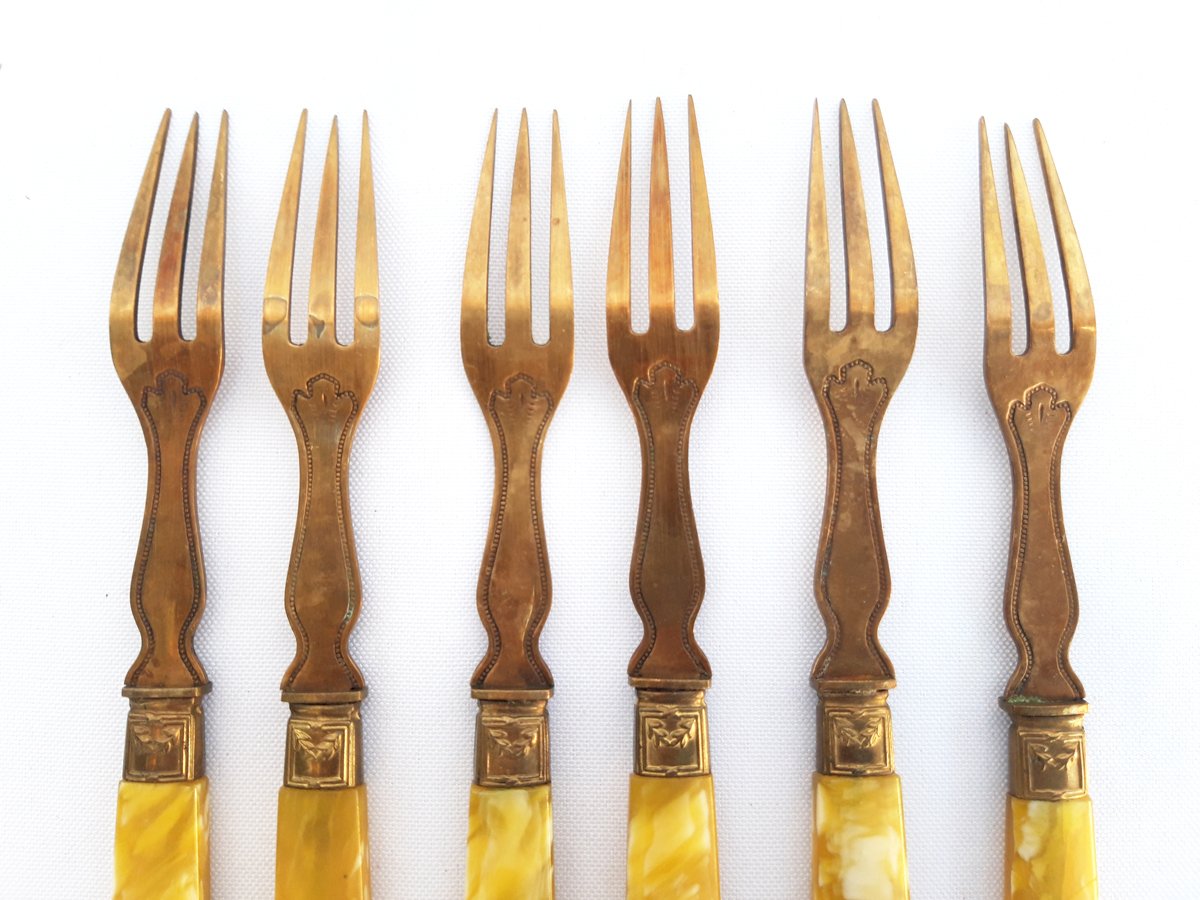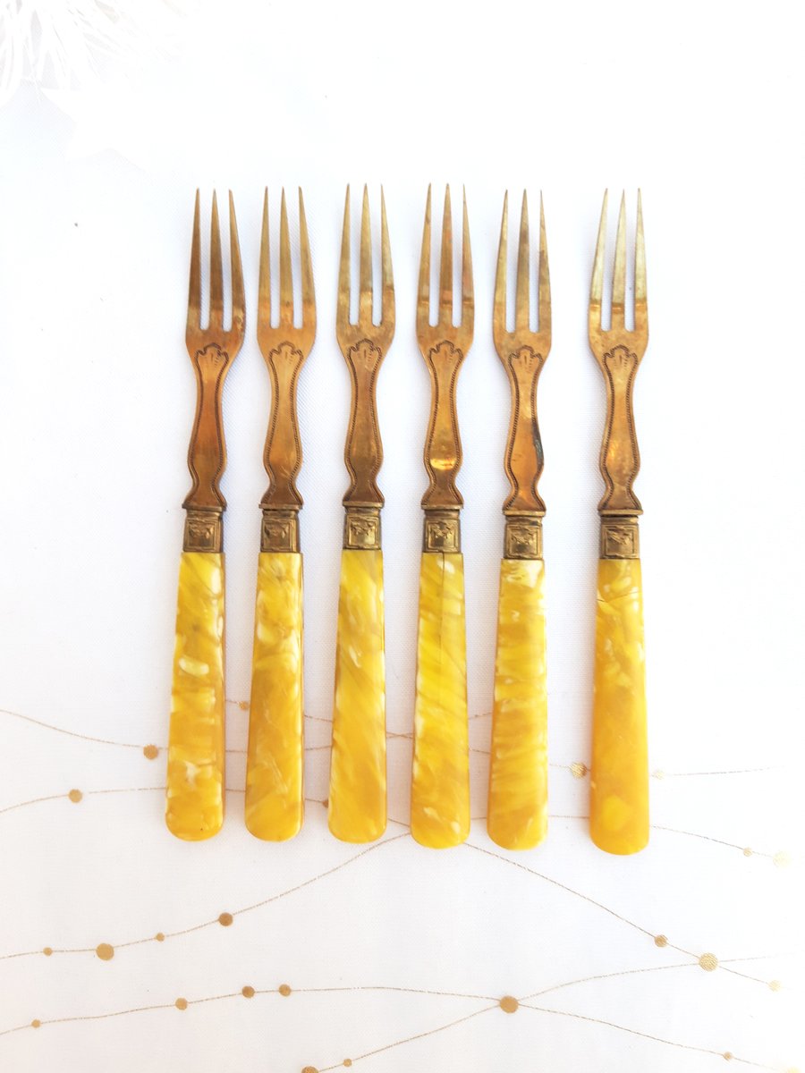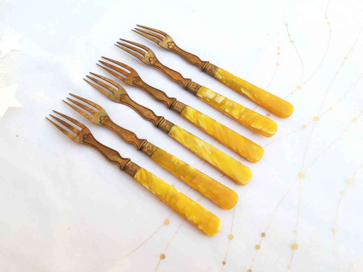 12 fourchettes à crustacés anciennes 1910 Doré/Jaune Bakélite/Laiton