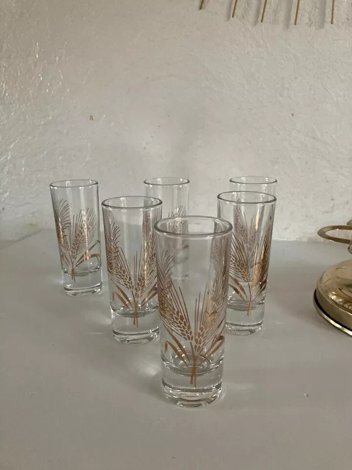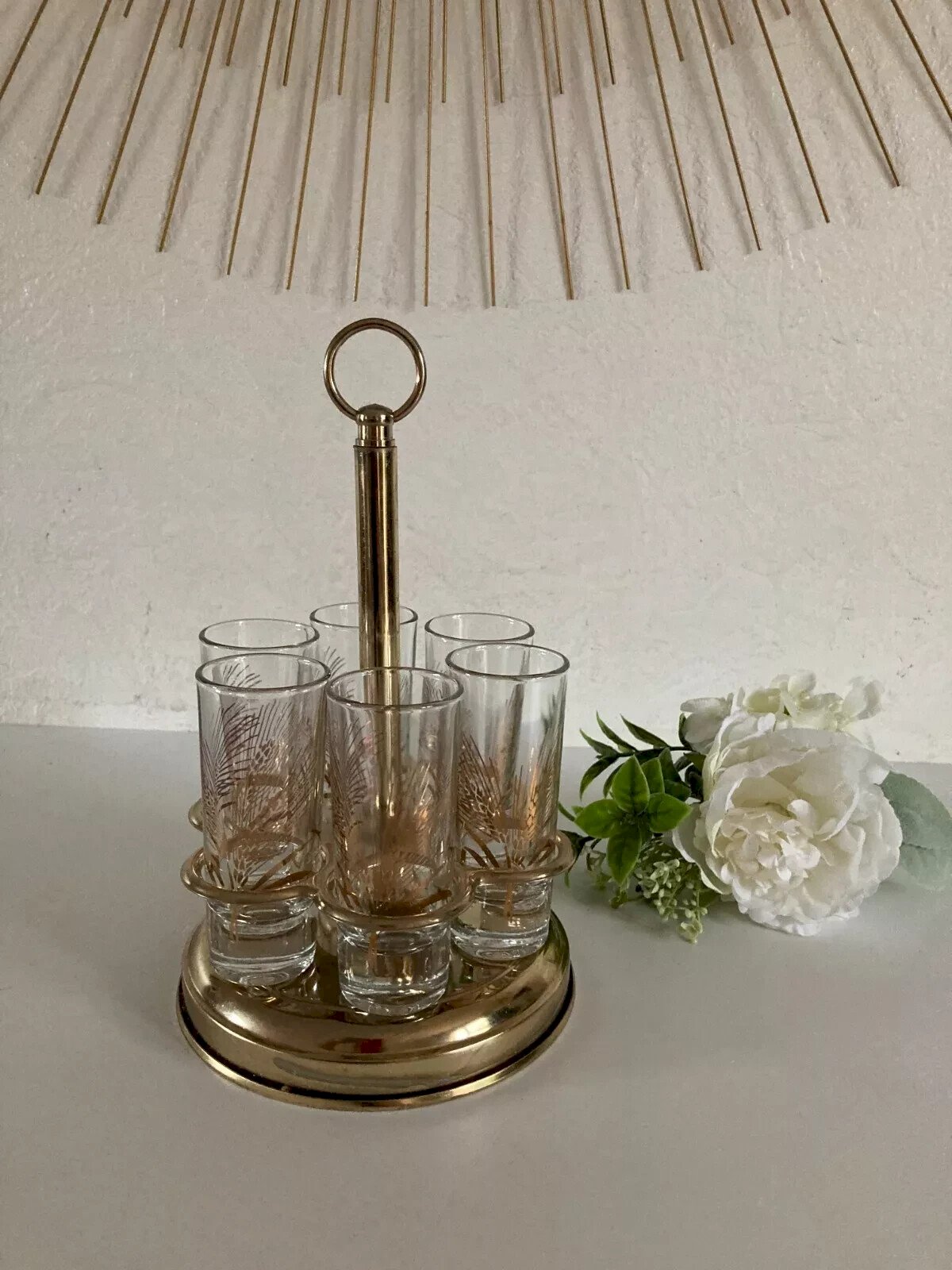 ⚜️ Ancien Service à Verres à Liqueur Support en Métal Doré Lot de 6 Verres Vintage ⚜️ Décor Blé Hauteur des verres 10 Cm Hauteur Total 21 Cm Pays d'origine:France