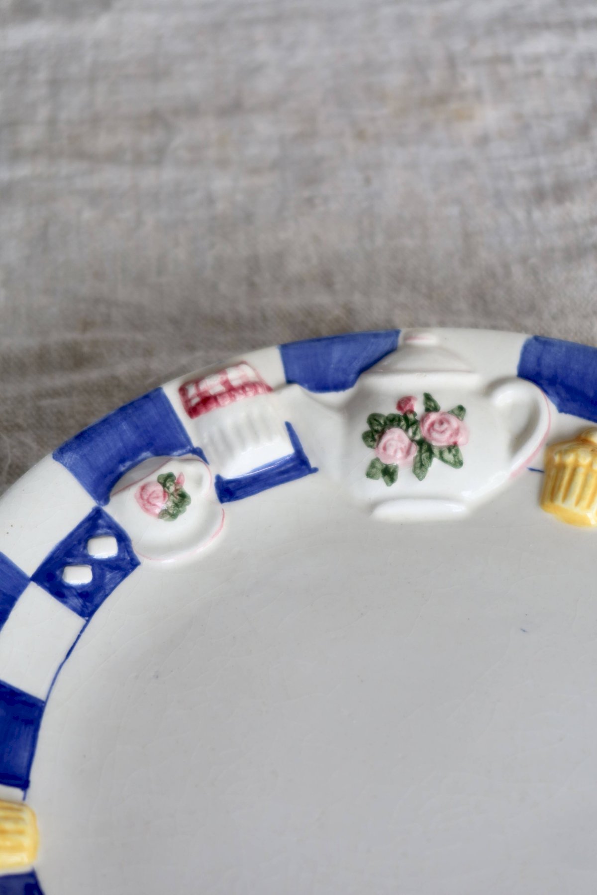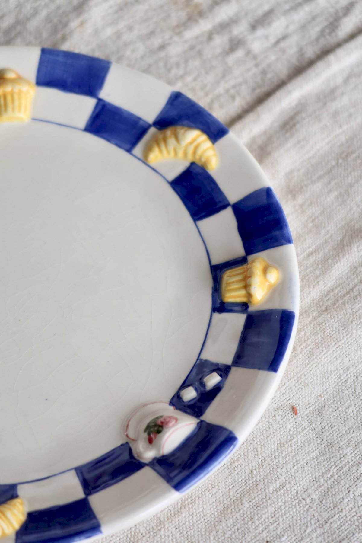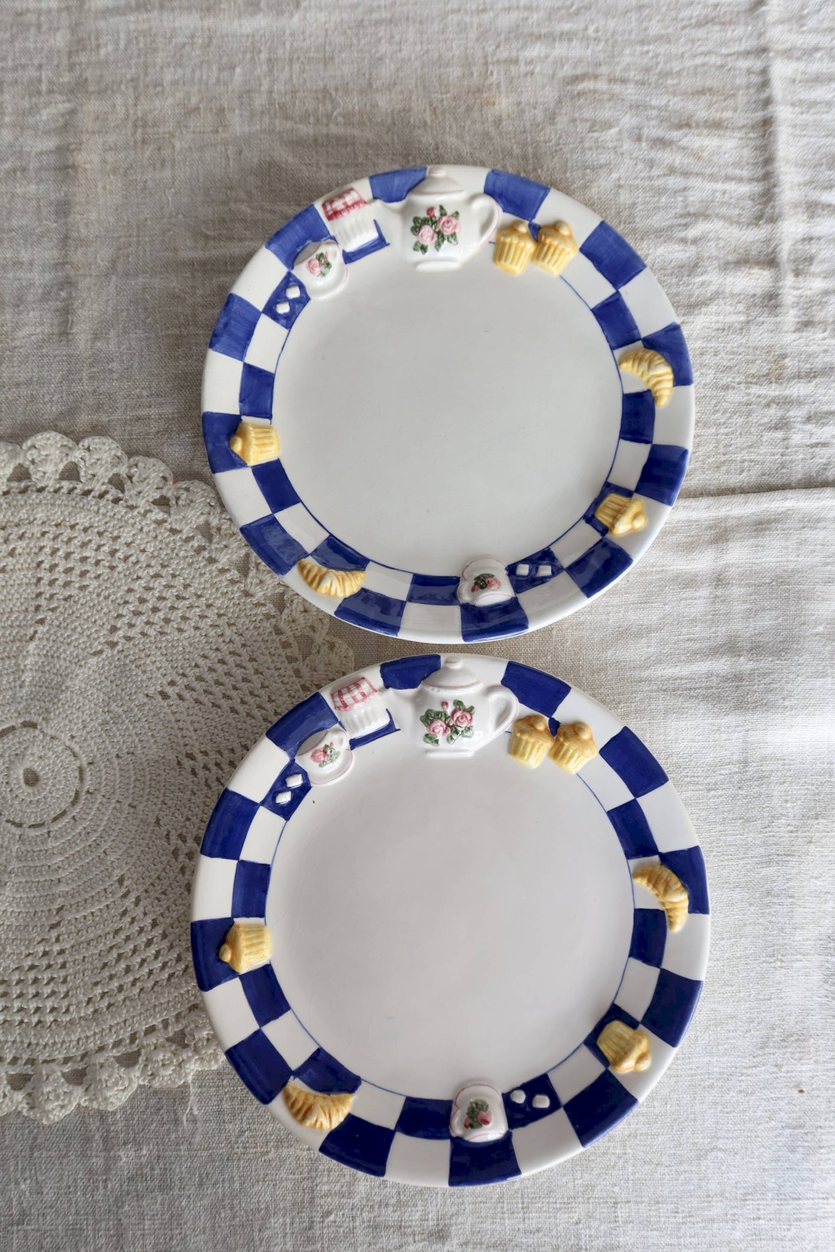 Jolie paire d'assiettes à dessert en barbotine, bord damier bleu souligné d’appliqués en relief (cafetière fleurie, tasse, croissants et muffins): duo assorti au look « petit déjeuner » très bistrot.Faïence blanche légèrement tressaillée par endroits, quelques micro-usures d’usage, ensemble cohérent et charmant.? Diamètre 20 cm.? Envoi soigné et suivi.