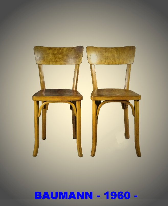 Paire de chaises Baumann de 1960     Une très belle prestation, elles sont prêtes à servir au quotidien, même en lieux publics.   Dimensions : Hauteur totale : 78 cm- hauteur d’assise : 47cm Assise : 38X37 cm Estampille Baumann sous la ceinture. Nous pouvons équiper gracieusement ces chaises de patins (origine Allemagne) vissés, adaptés par leur matière au revêtement de la pièce où elles serviront. Travail effectué après achat. Plus de photos et renseignements sur demande. Expédition France ou enlèvement Alsace Couleur:Noyer clair Nombre de pièces:2 Type:Chaise Marque:Baumann Origine:France Période:Design du XXème Pays d'origine:France Matière:Hêtre Style:1940-1960