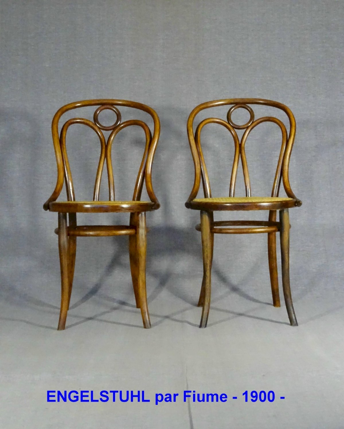 Paires de Chaises dites Engelstuhl, une production de la manufacture de Fiume, ville portuaire de l’Adriatique (empire Austro-Hongrois) 1890/1900.Cette manufacture entra dans la Société MUNDUS en 1907.   Belle construction avec des sections de bois respectables. Chaises en très bon état, peut servir au quotidien. Excellente ergonomie quasiment un fauteuil !   Hauteur d’assise : 47 cm - Hauteur Totale :92 cm- Diamètre ass :41.5 cm- largeur Totale : 45 cm   Le dessin du dossier est la copie quasi conforme de la N°36 de KOHN.   Sous gomme-laque naturelle noyer-blond. Assises récemment cannées en parfait état. Estampille sous la ceinture d’assise.   Plus de photos et renseignements sur demande. Livraison France et Europe ou enlèvement Alsace. État:OccasionObjet ayant été utilisé. Objet présentant quelques marques d'usure superficielle, entièrement opérationnel et fonctionnant correctement. Il peut s'agir d'un modèle de démonstration ou d'un objet retourné en magasin après une courte période d'utilisation. les éventuelles imperfections. Couleur:Marron Marque:FIUME Type:Chaise Hauteur:92 Longueur:45 cm Largeur:45 cm