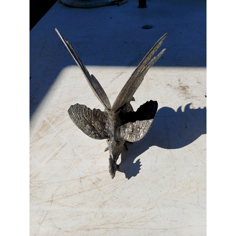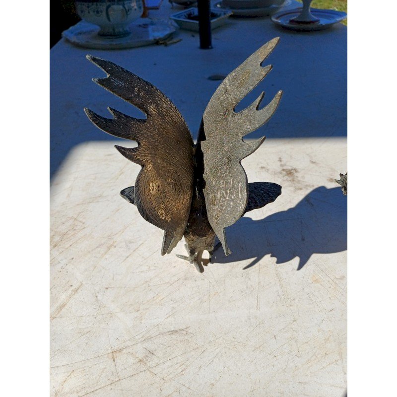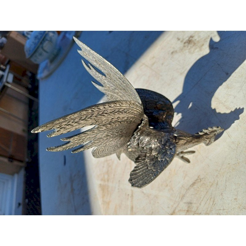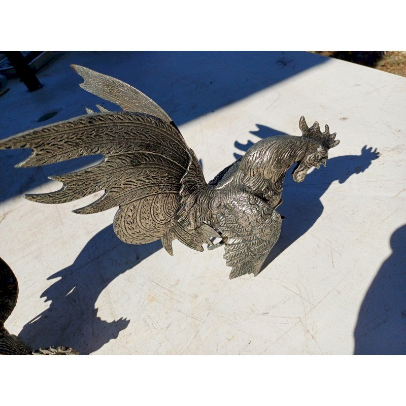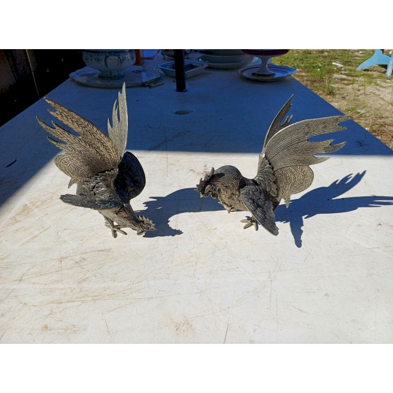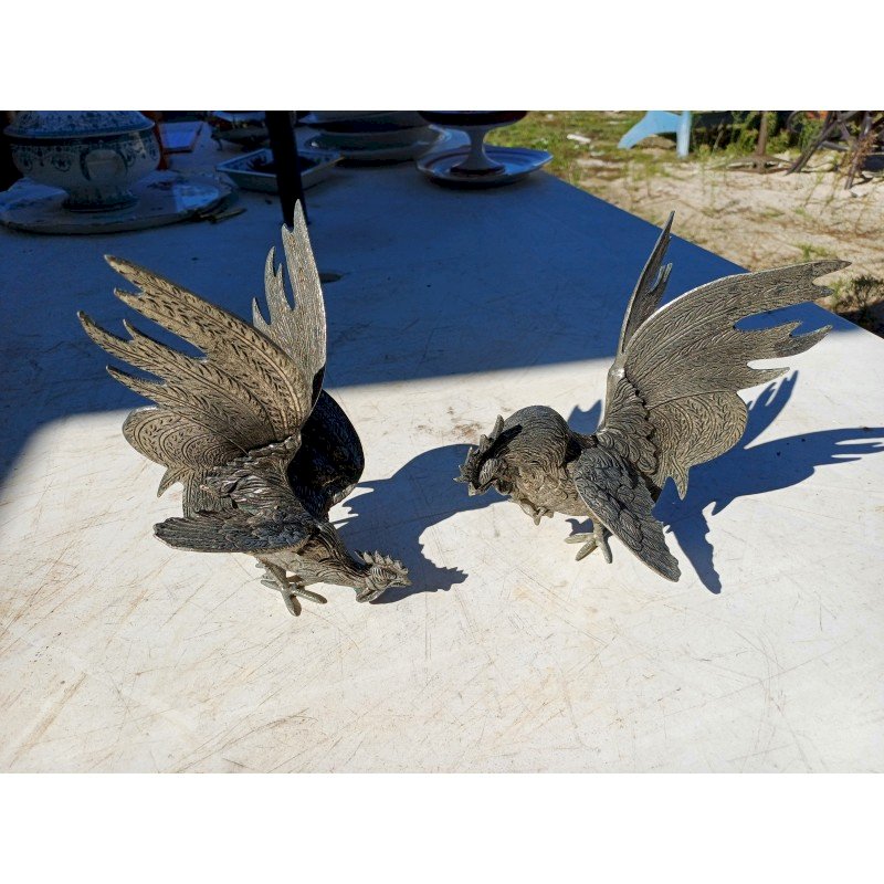 2 Coqs en Métal Argenté , " au Combat " , Haut : 18 cm , long et larg : 16 cm sur 14 cm  , poids : 1,5 Kg , trés bon ètat ,