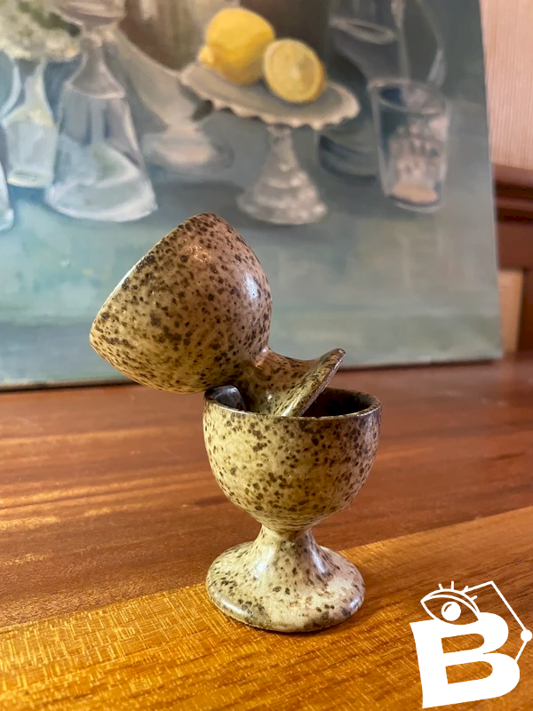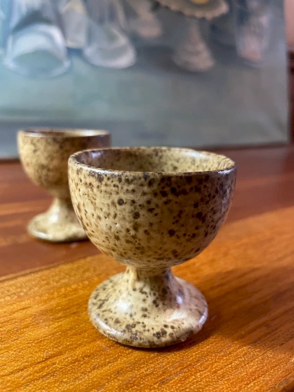 2 coquetiers en grès moucheté pyrité vintage Très bon état Hauteur 5,5cm, diamètre intérieur 4cm