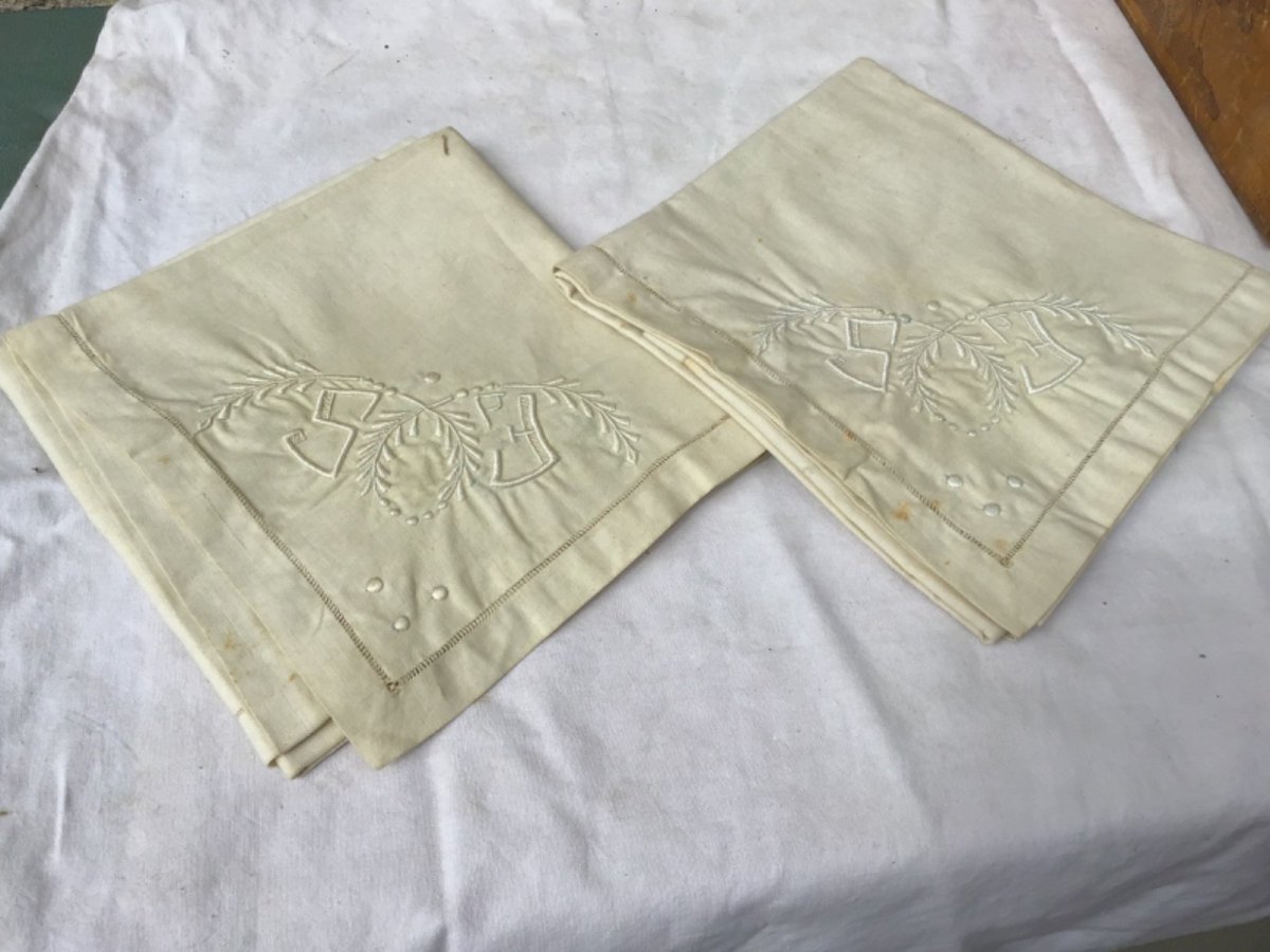 Début du XXème siècle Neuves av3c étiquette jamais utilisé  2 Grandes taies d'oreiller en toile de CHOLET brodé à la main du monogramme et de fleurs, ainsi que de rangs de jours fantaisie.  il s'agit pas d'une paire ! Dimensions : 70 x 70 cm Poids : 455g Type:Textile ancien Origine:France Période:Art Nouveau