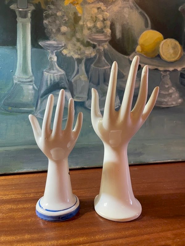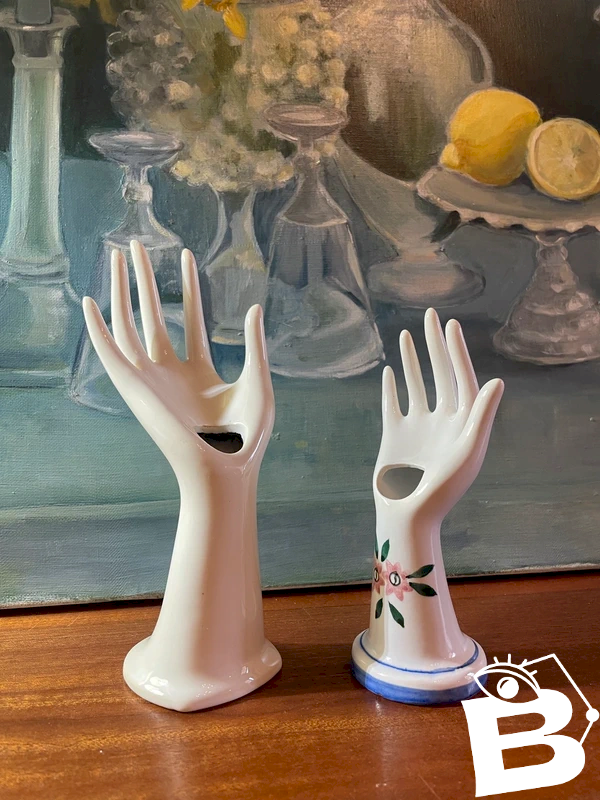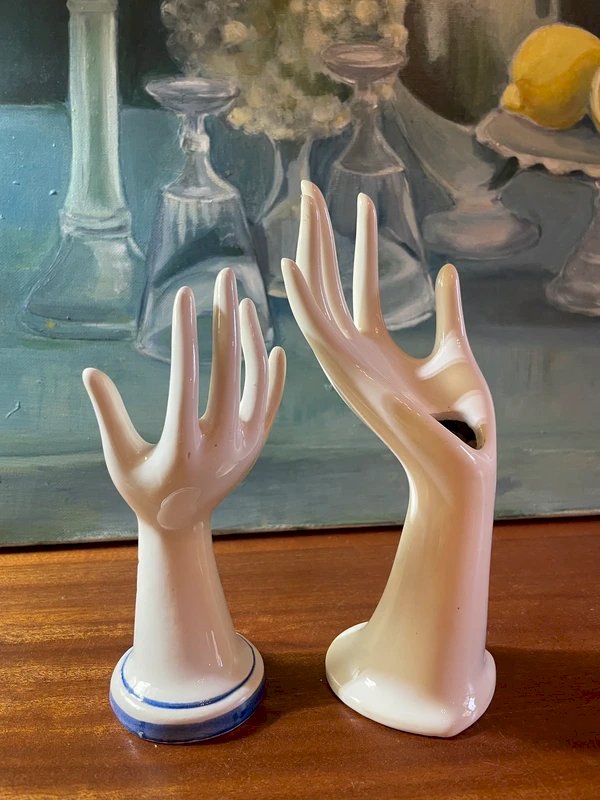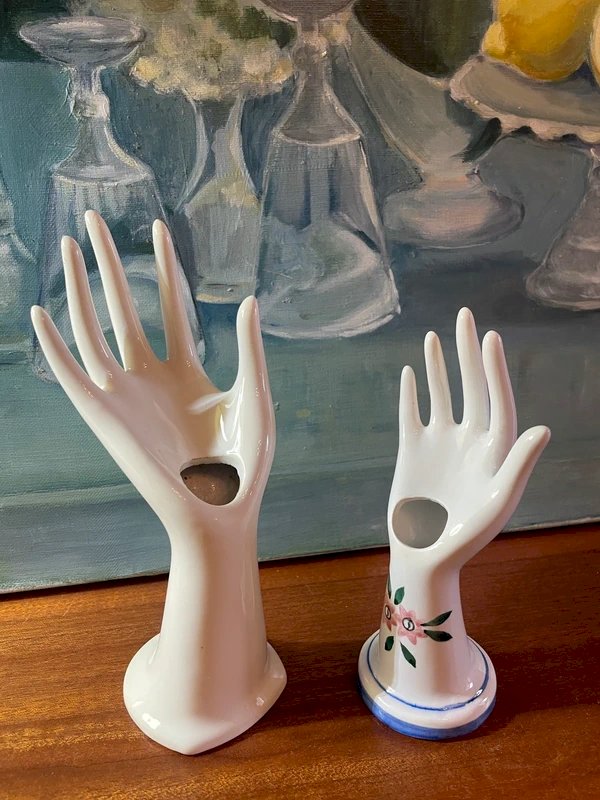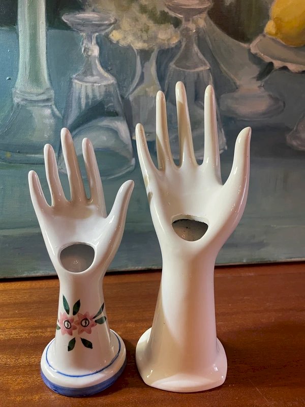 2 mains baguier vintage en céramique blanche Hauteur 19,5cm pour la grande la mousse d’origine pour piquer les fleurs est encore présente à l’intérieur) 16cm de haut,pour la petite