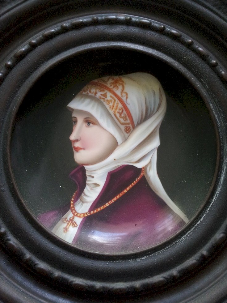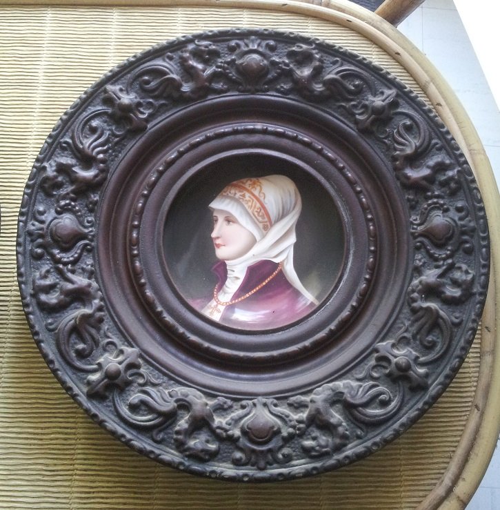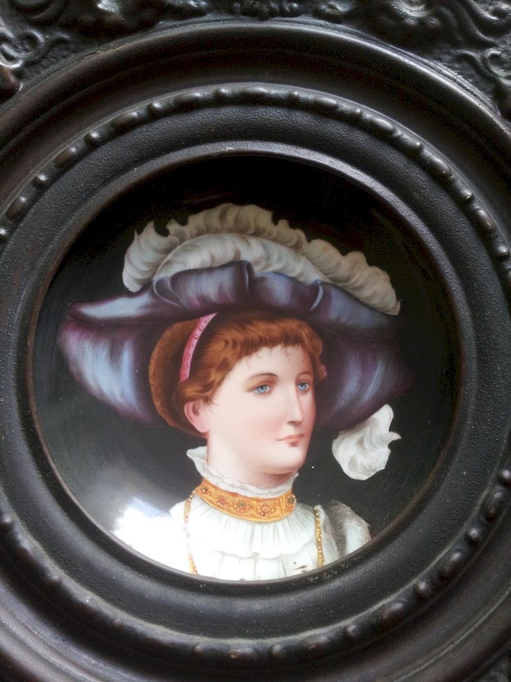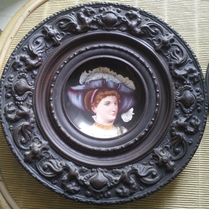 2 anciens plats décoratifs en métal (laiton ou cuivre) repoussé et porcelaine, ornés de portrait de femme. Pas de marque.