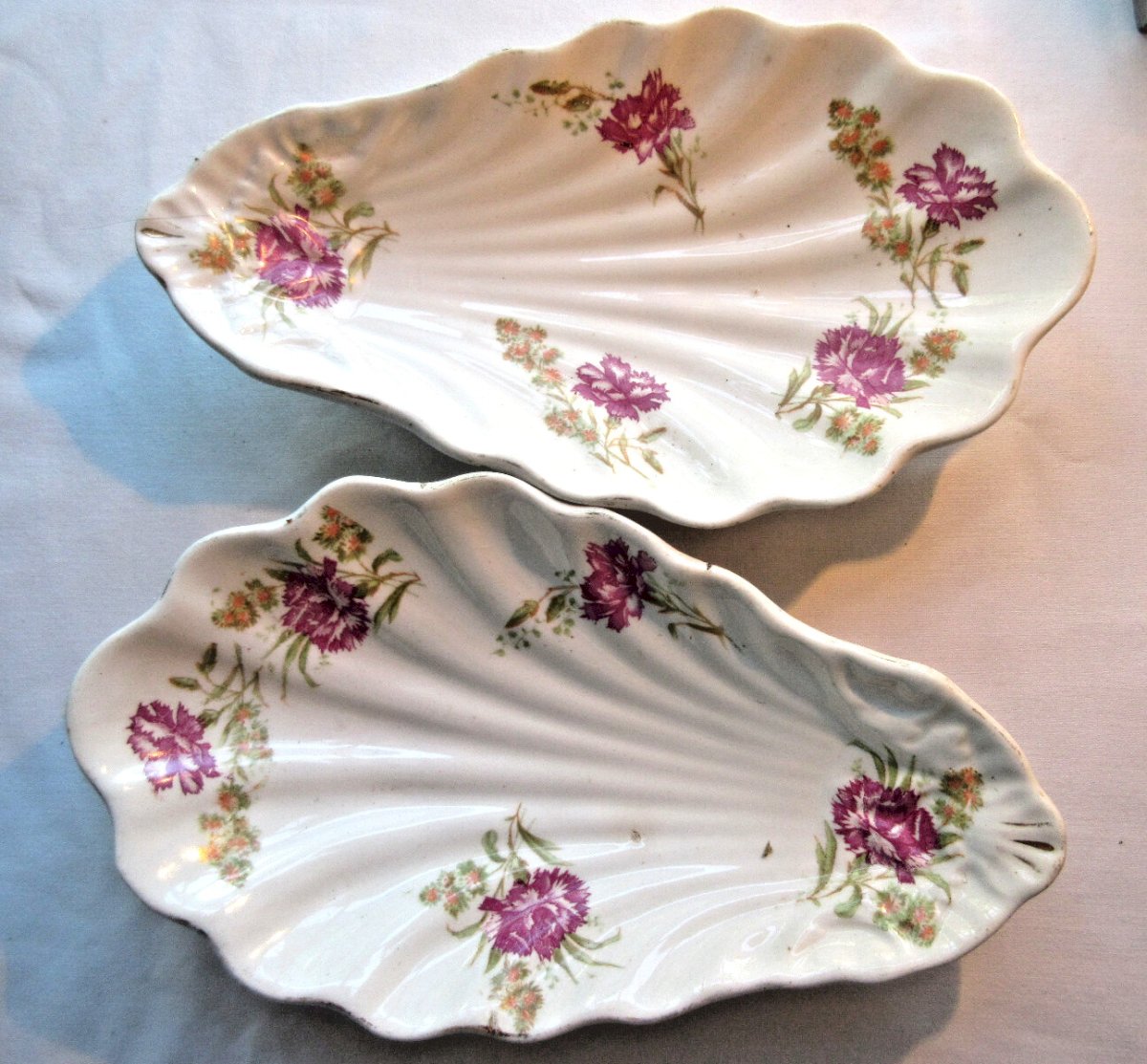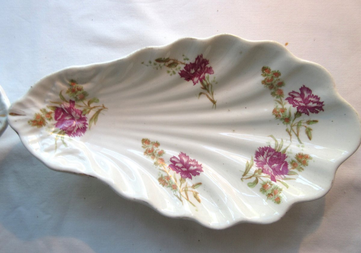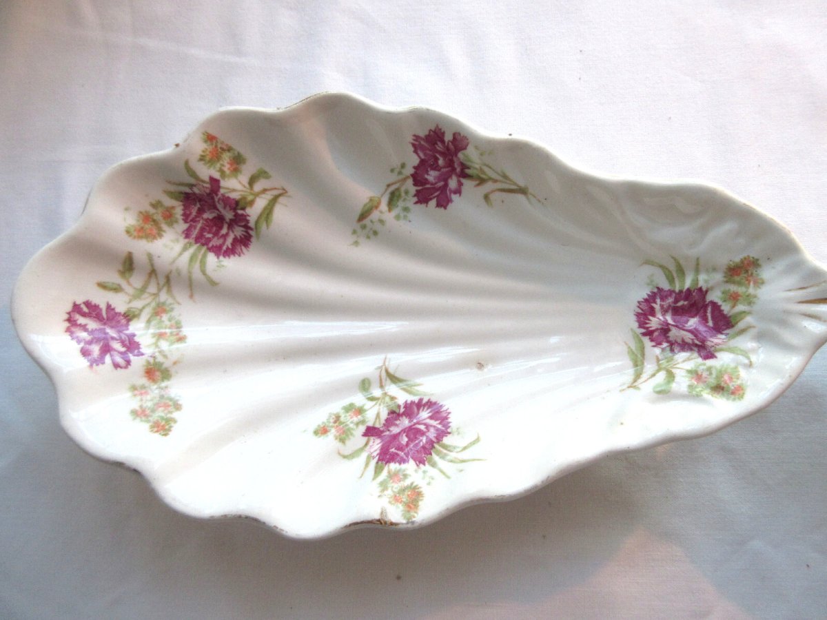 Vente dans le monde entier. 2 raviers "Coquille" d'Onnaing. 2 raviers ou beurriers en faïence d'Onnaing. Ils sont en forme d'un coquillage  avec un décor d'oeillets roses. Dessous, voir signature. Dimensions: 21 cm X 12 cm. Bon état, sans défaut. Les photos complètent la description.