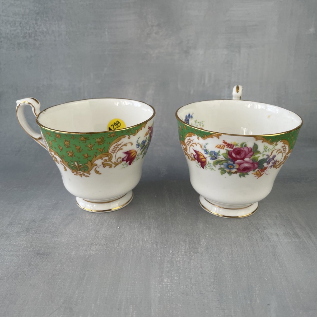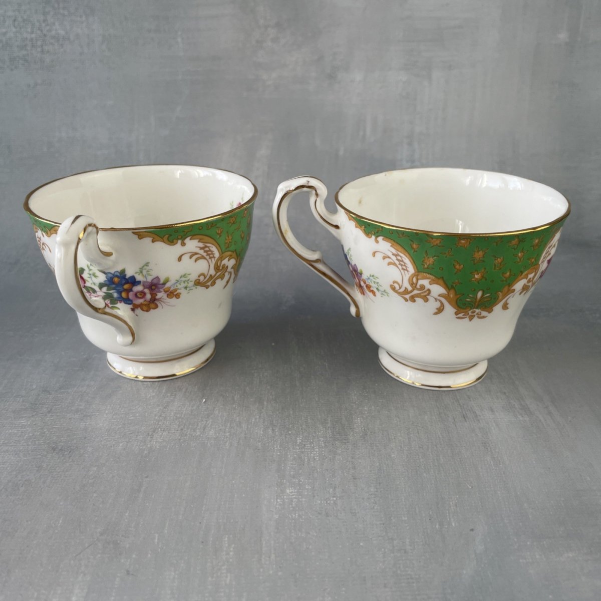 2 tasse à thé porcelaine anglaise Majesty the queen PARAGON Rockingham (vert)