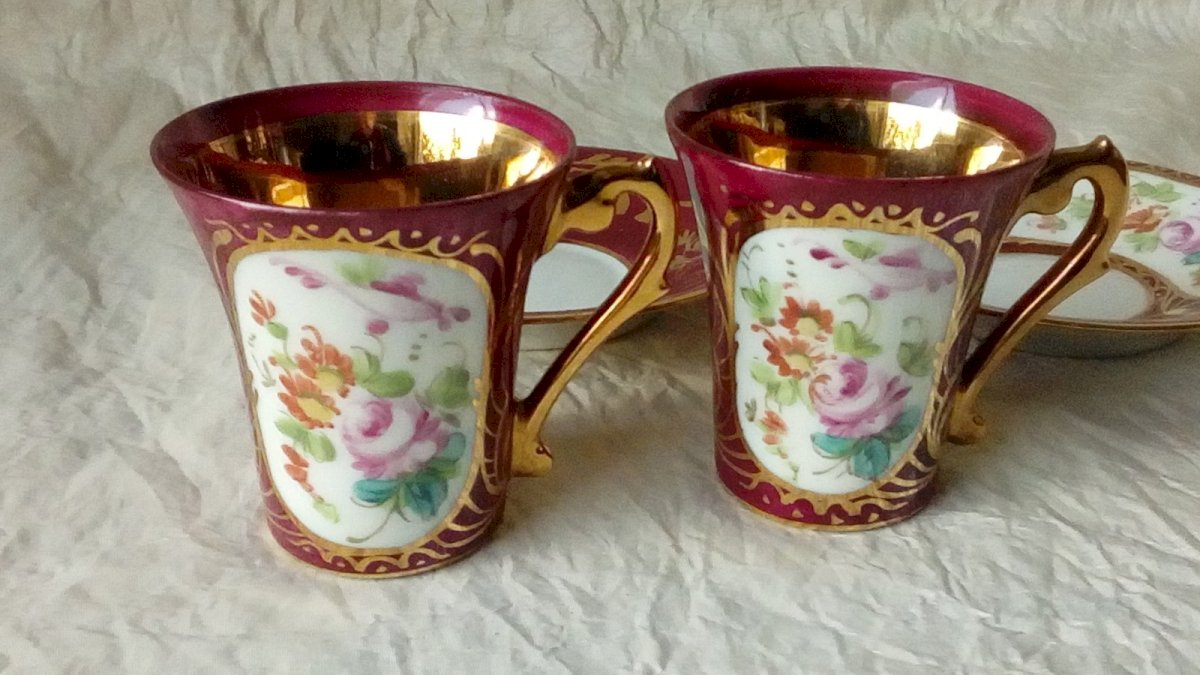 2 TRES BELLES TASSES A MOKA EN PORCELAINE DE PARIS NODROG PARIS FAIT MAIN DECOR FLORAL STYLE NAPOLÉON 3 TASSES HAUTEUR 5.90 cm  DIAMETRE 5.40 cm DIAMETRE DES SOUS TASSES 10 cm Pays d'origine:France