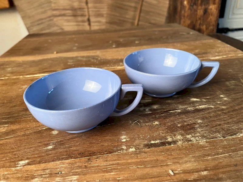 2 tasses à thé Sarreguemines en faïence ancienne d’un très joli bleu.
