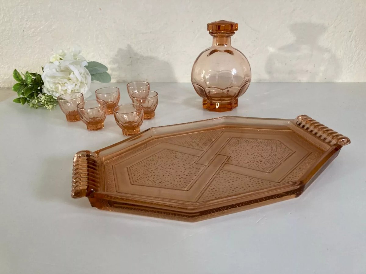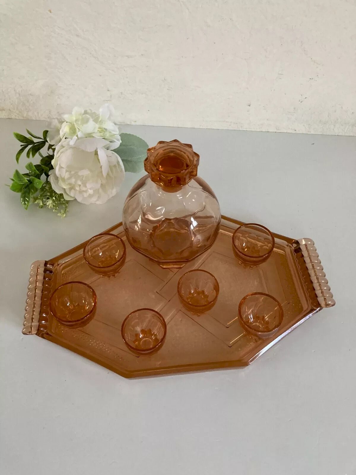 ⚜️ Ancien Service à Liqueur en Verre Couleur Rose Avec Plateau Vintage ⚜️ Hauteur des verres 4 Cm, Longueur du plateau 31 Cm Hauteur de la carafe 14 Cm Important une petite ébréchure au bout du Bouchon voir photos Matière:Verre Pays d'origine:France