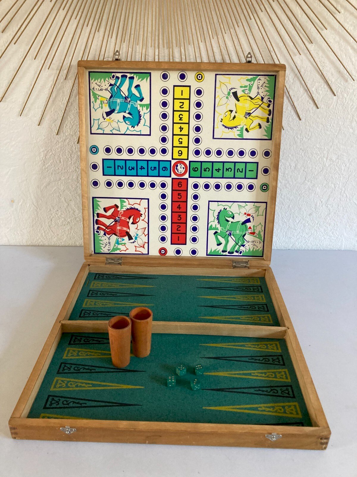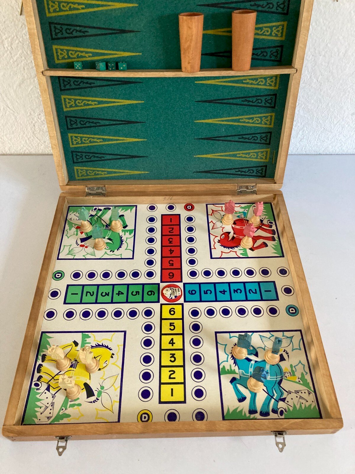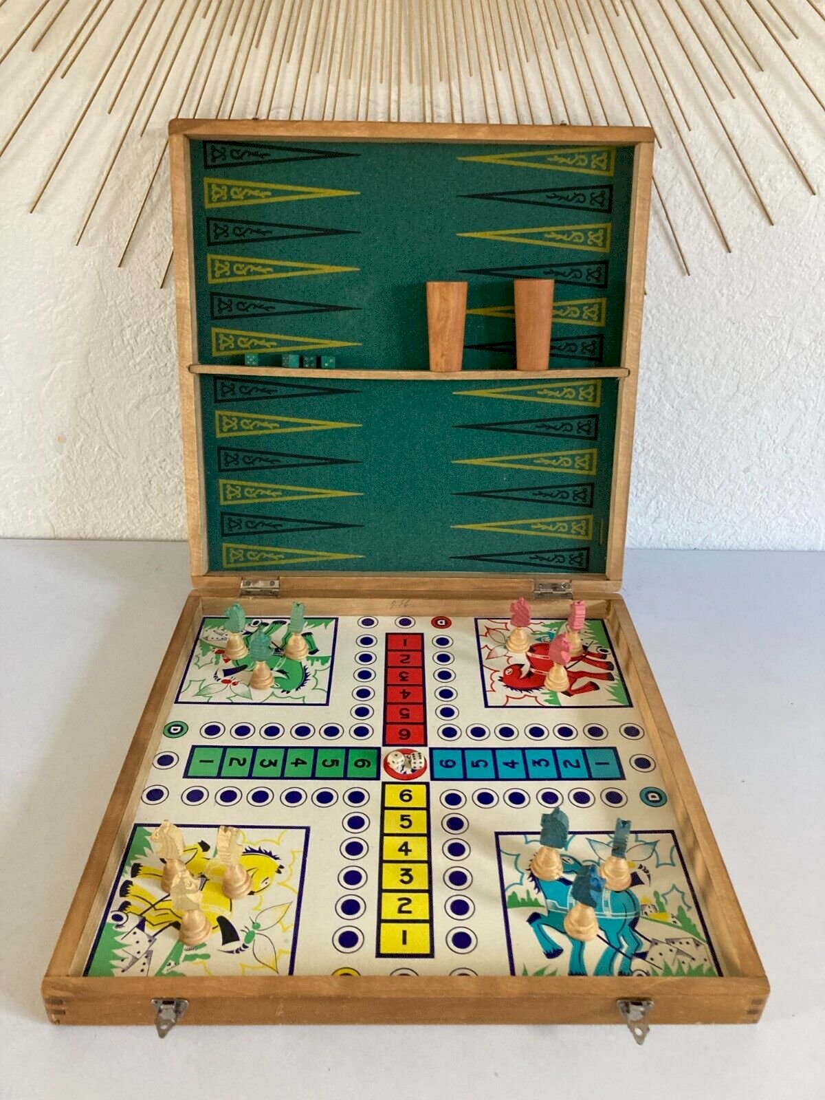 225⚜️ Ancienne Malette de Jeu en Bois Plusieurs Jeux de Société Complet Vintage