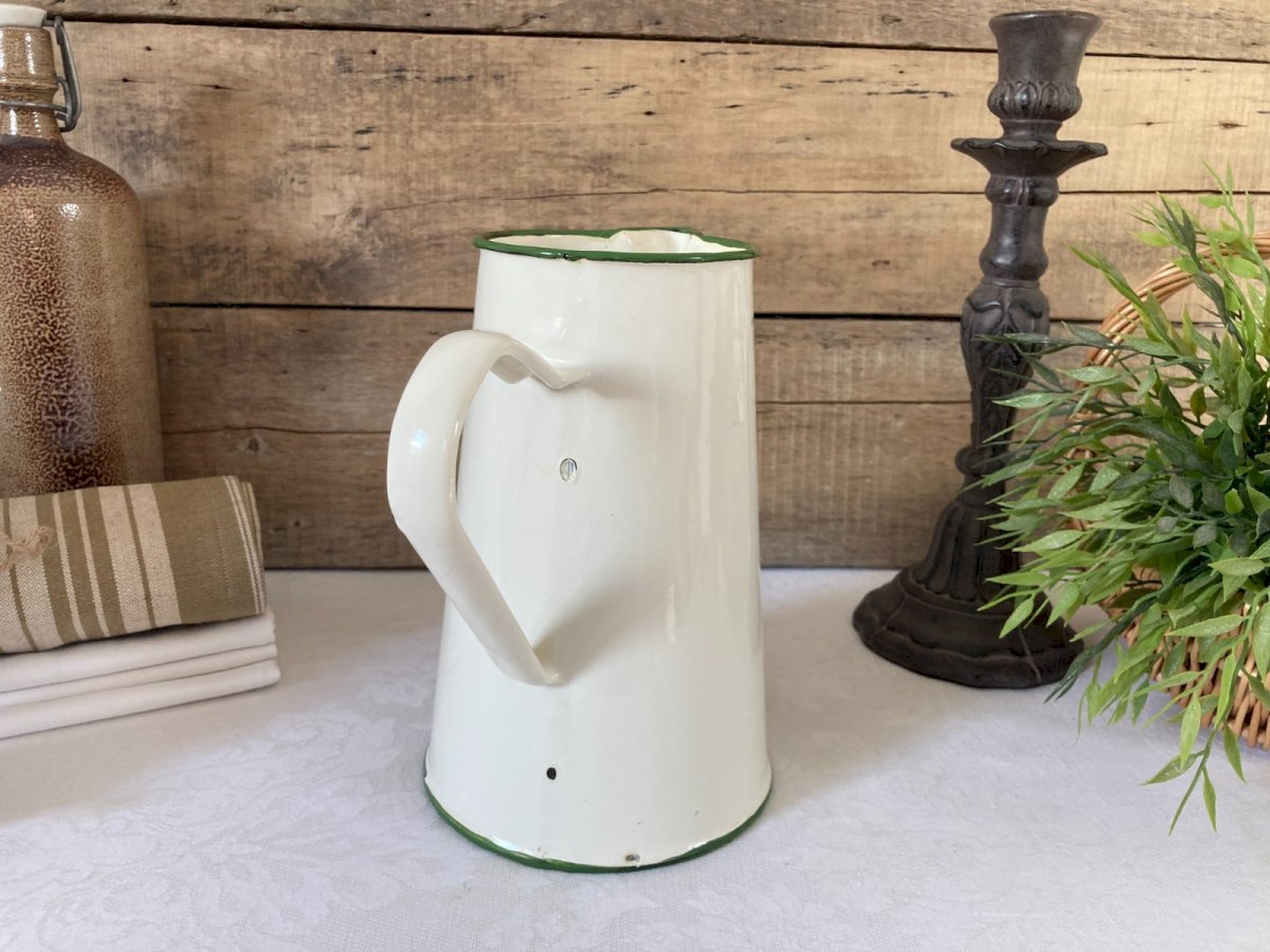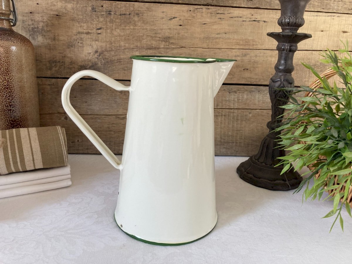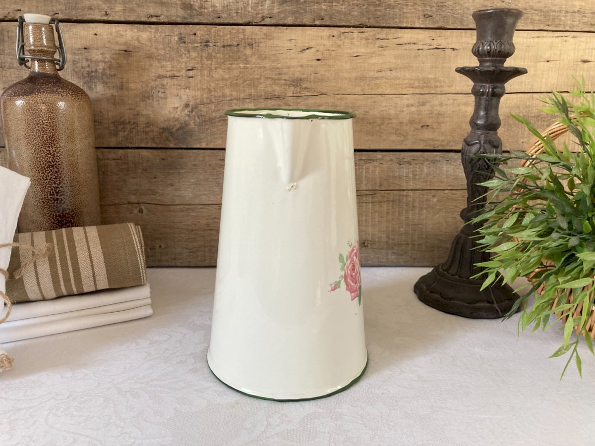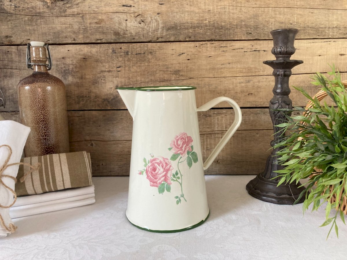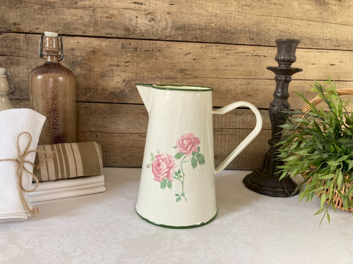 ⚜️ Déco Ancien Broc Pichet en Tôle Émaillé Décor Fleurs Rose ⚜️ Hauteur 22 Cm Couleur Crème liseré vert Type:Pichet Pays d'origine:France métropolitaine Matière:Tole émaillée