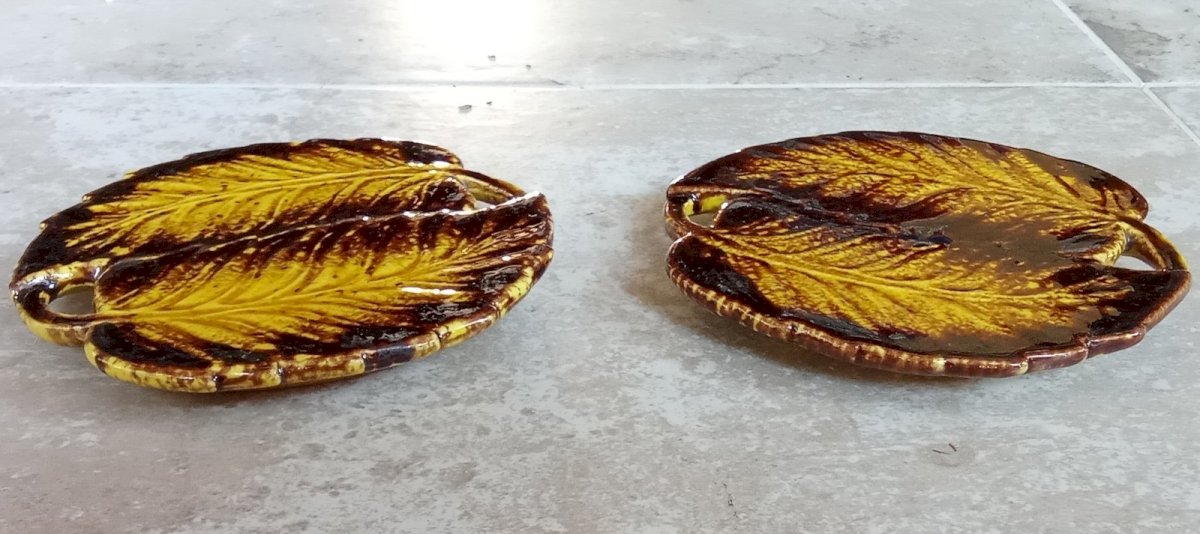 3 Anciens Plateau Dessous De Plat Céramique Barbotine Feuille Kernadec Paris