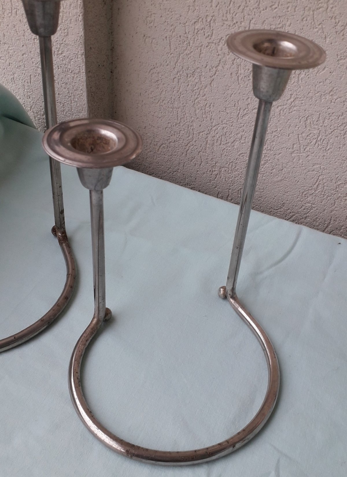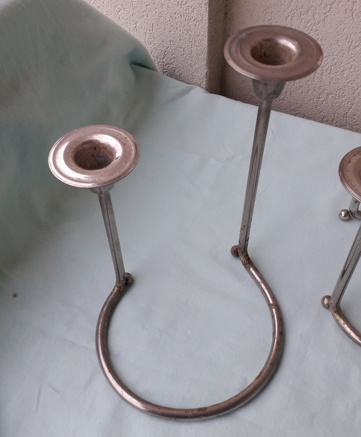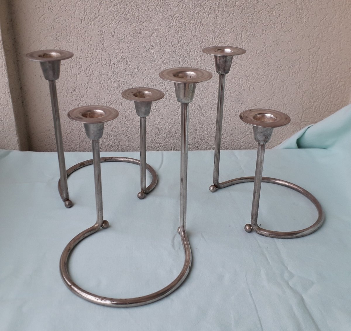 3 bougeoirs doubles design en métal argenté sans marque ni signature (peut-être produit par BMF ?).