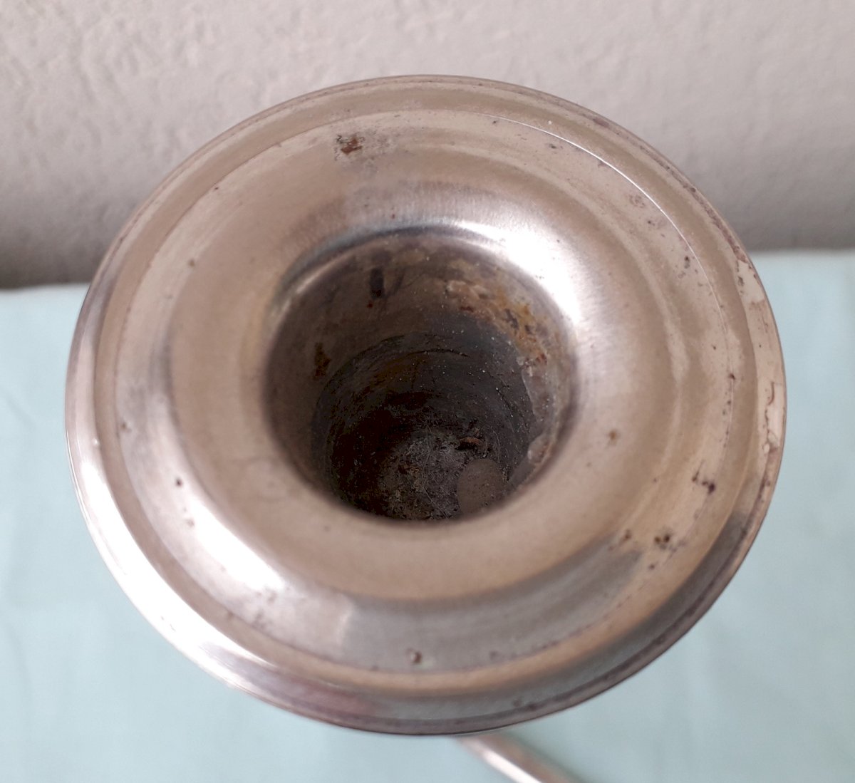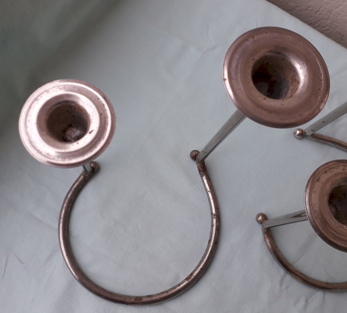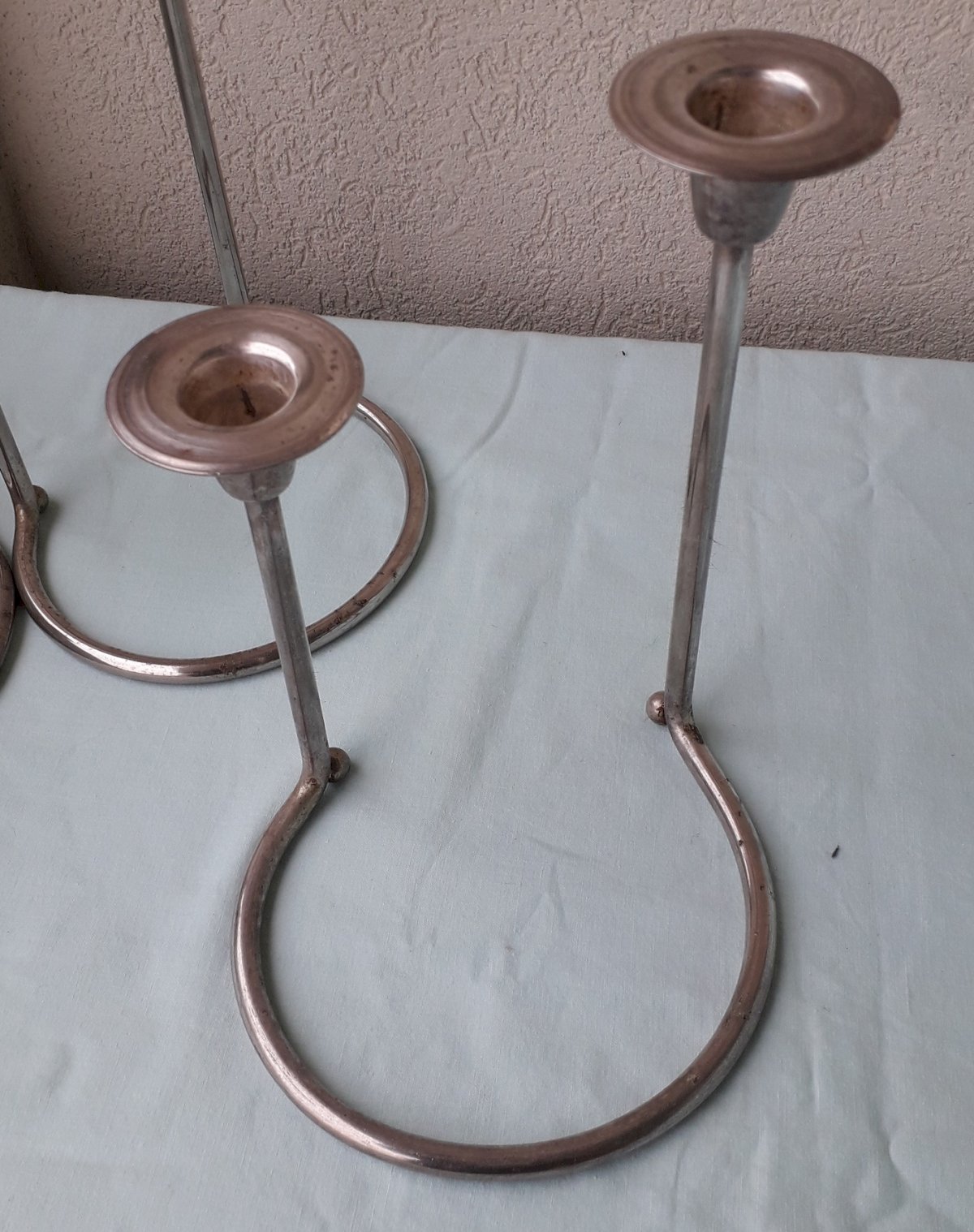 3 bougeoirs doubles design en métal argenté sans marque ni signature (peut-être produit par BMF ?).