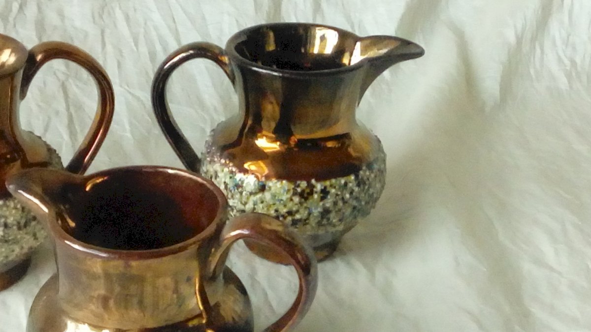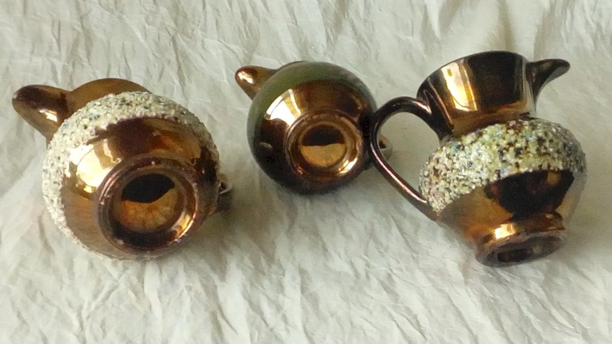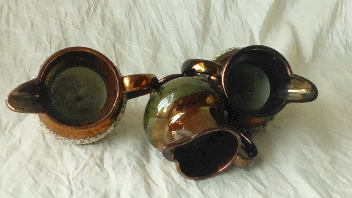ENSEMBLE DE 3 PETITS PICHETS FAIENCE DE JERSEY FIN 19 EME HAUTEUR 7 cm POUR LES 2 MÊMES PICHETS LARGEUR 8.50 cm DU BEC VERSEUR A L'ANSE LE 3 EME FAIT 5 cm de haut ET 7 cm DE LARGE DU BEC VERSEUR A L'ANSE EN BON ETAT Pays d'origine:Royaume-Uni