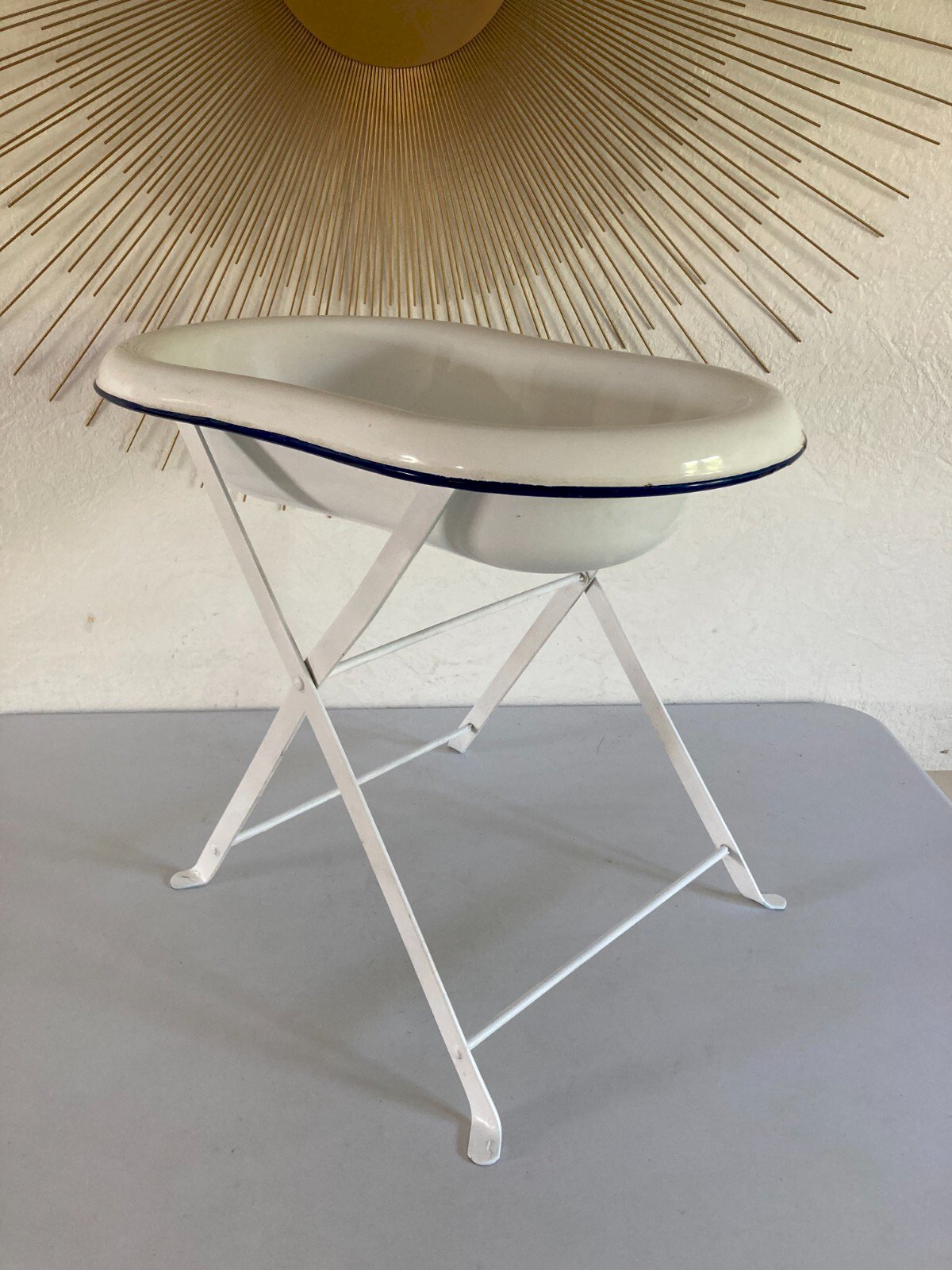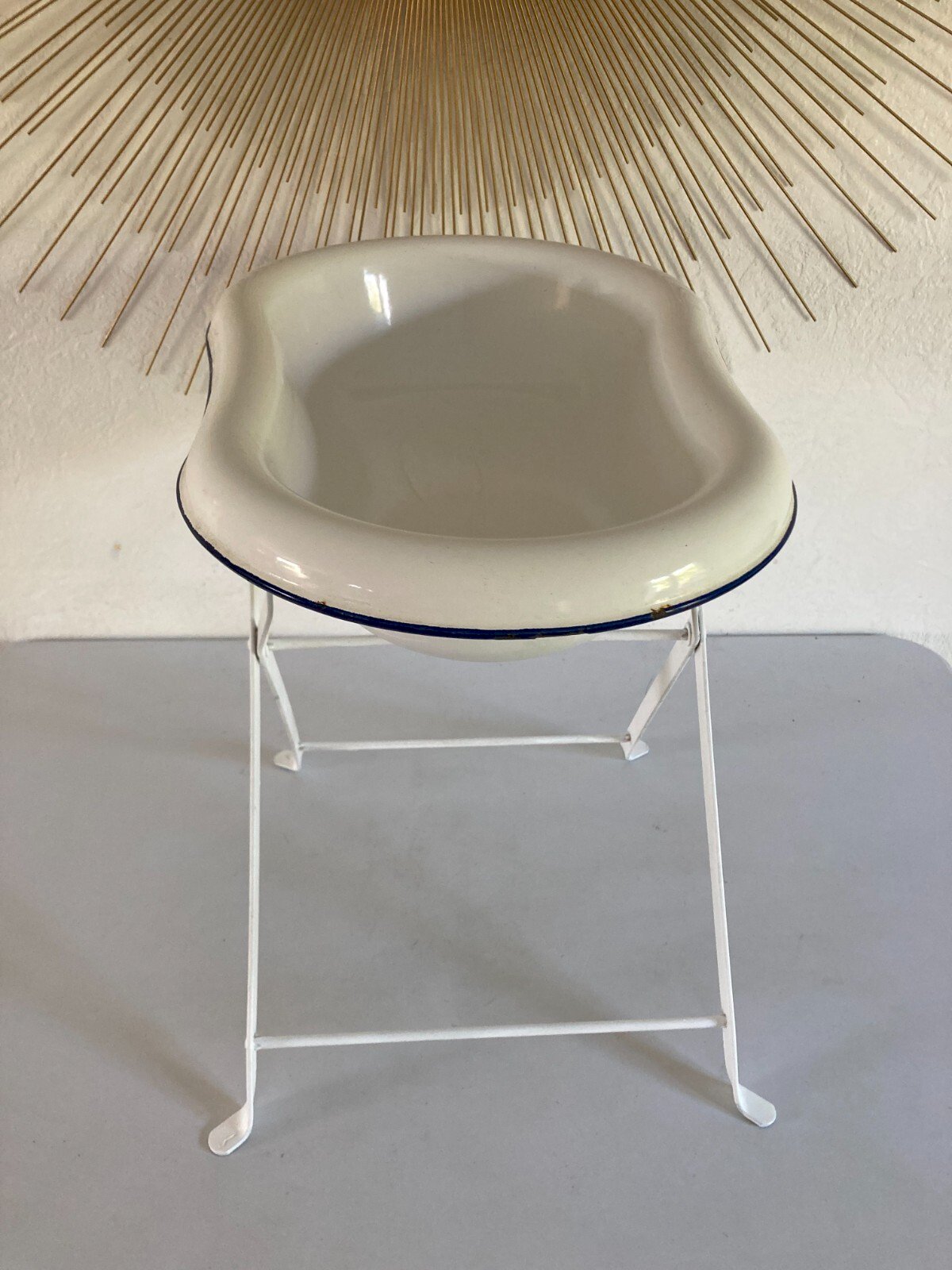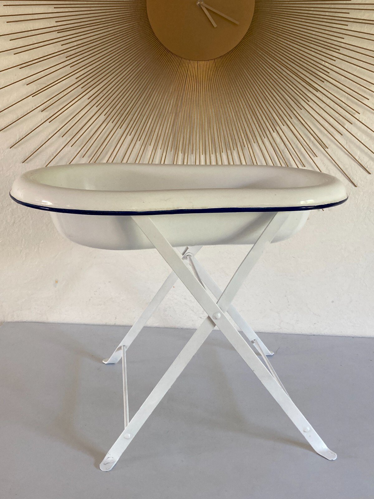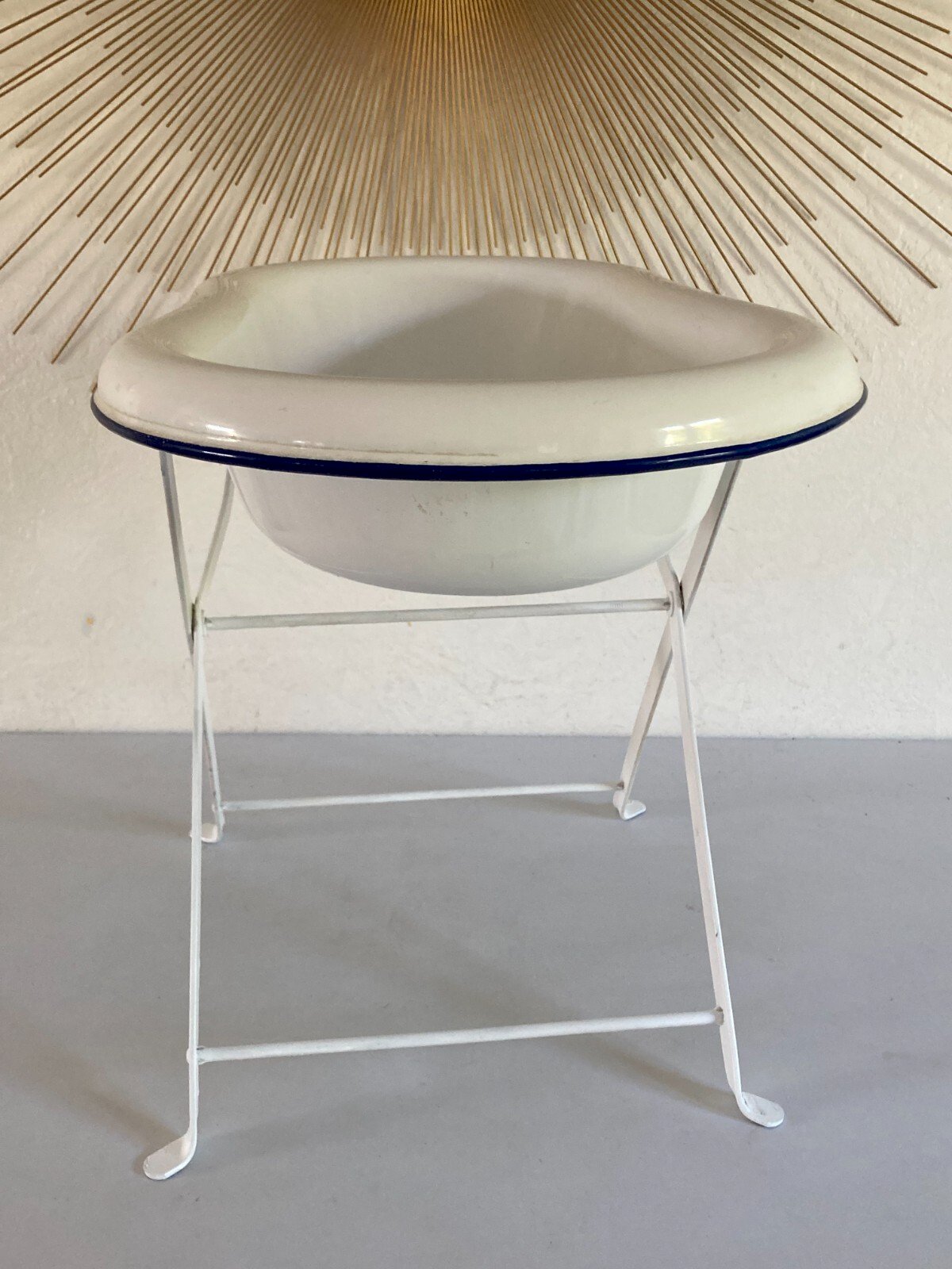 ⚜️ Ancienne Bassine Bidet Sur Pieds en Tôle Émaillée Blanc Liseré Bleu ⚜️ Longueur 50 Cm, Hauteur Total 40 Cm Type:Bidet Matière:Tôle émaillé Pays d'origine:France