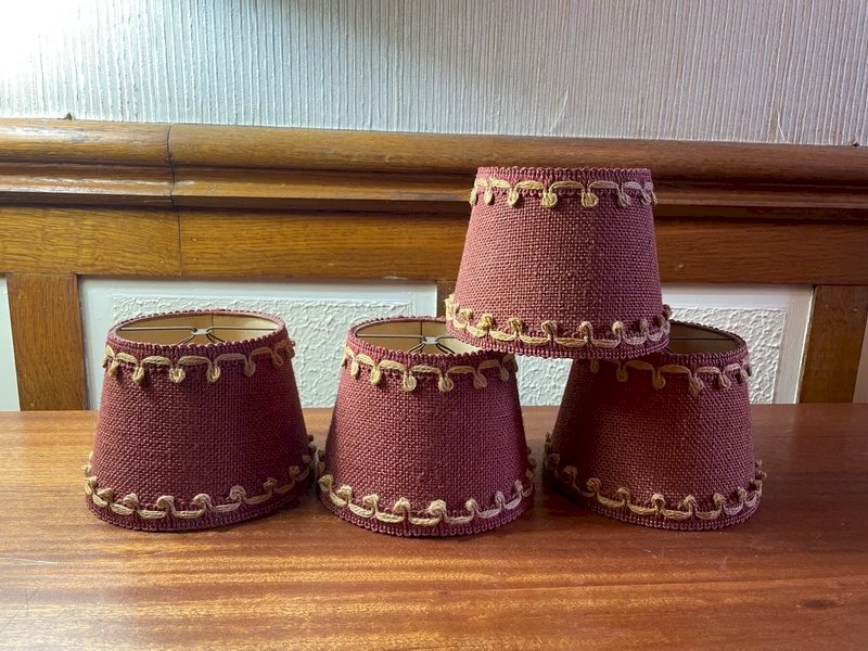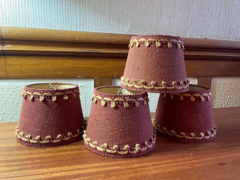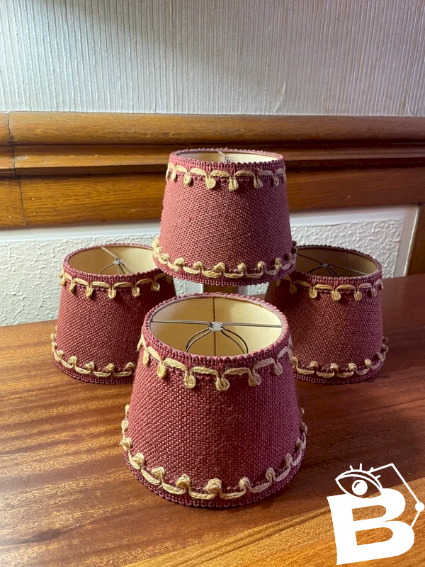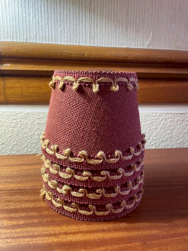 4 abats-jour a pince vintage Toile de jute bordeaux et frise naturelle Hauteur 11cm, diamètre bas 14cm, diamètre haut 10,5cm