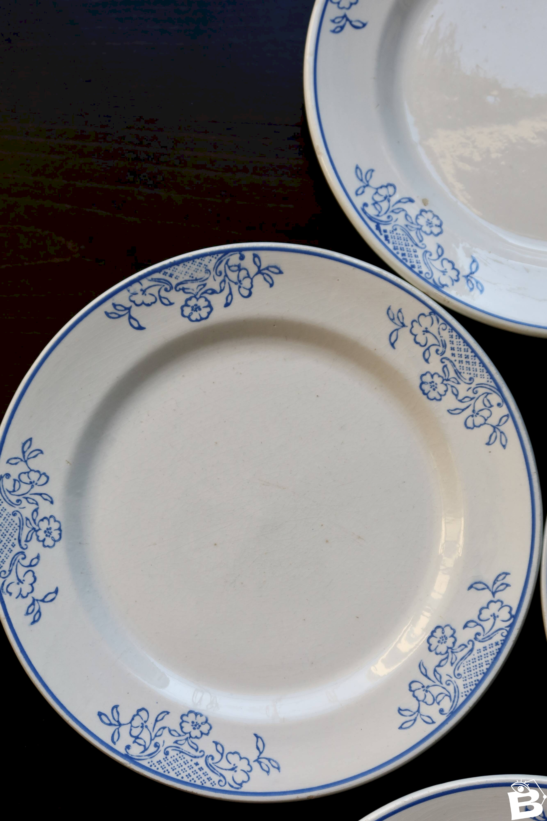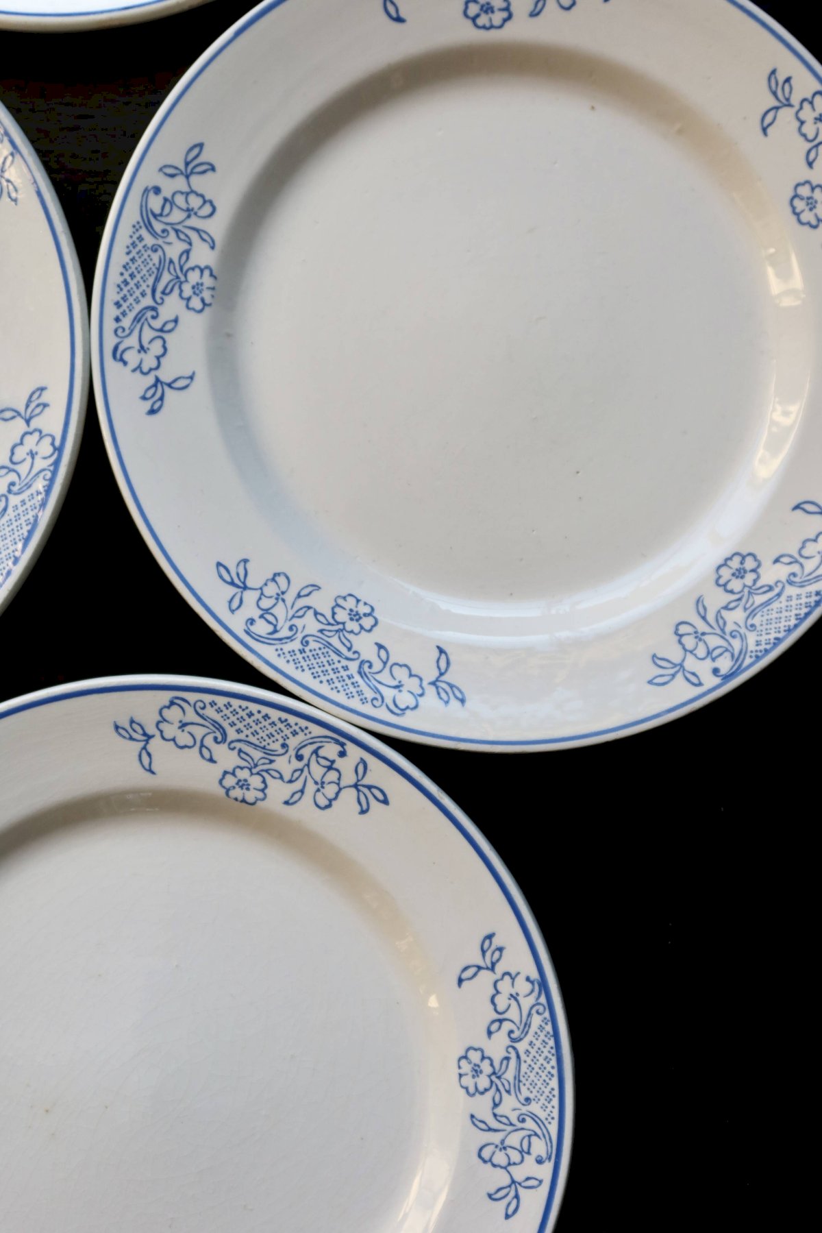 4 assiettes à dessert vintage faïence - Liseré bleu et motif fleuri