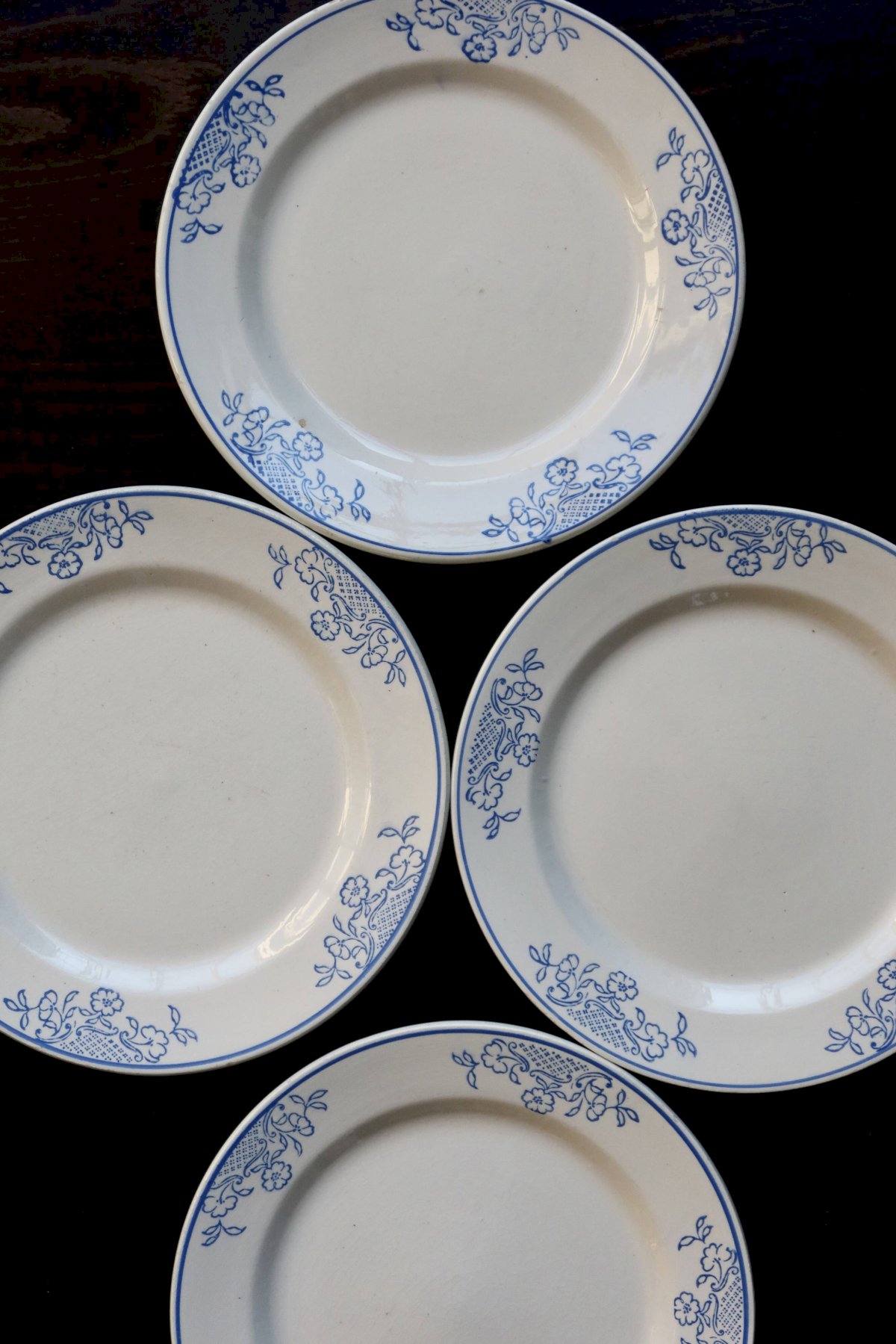 4 assiettes plates vintage en faïence banche et bleue - Décor fleuri