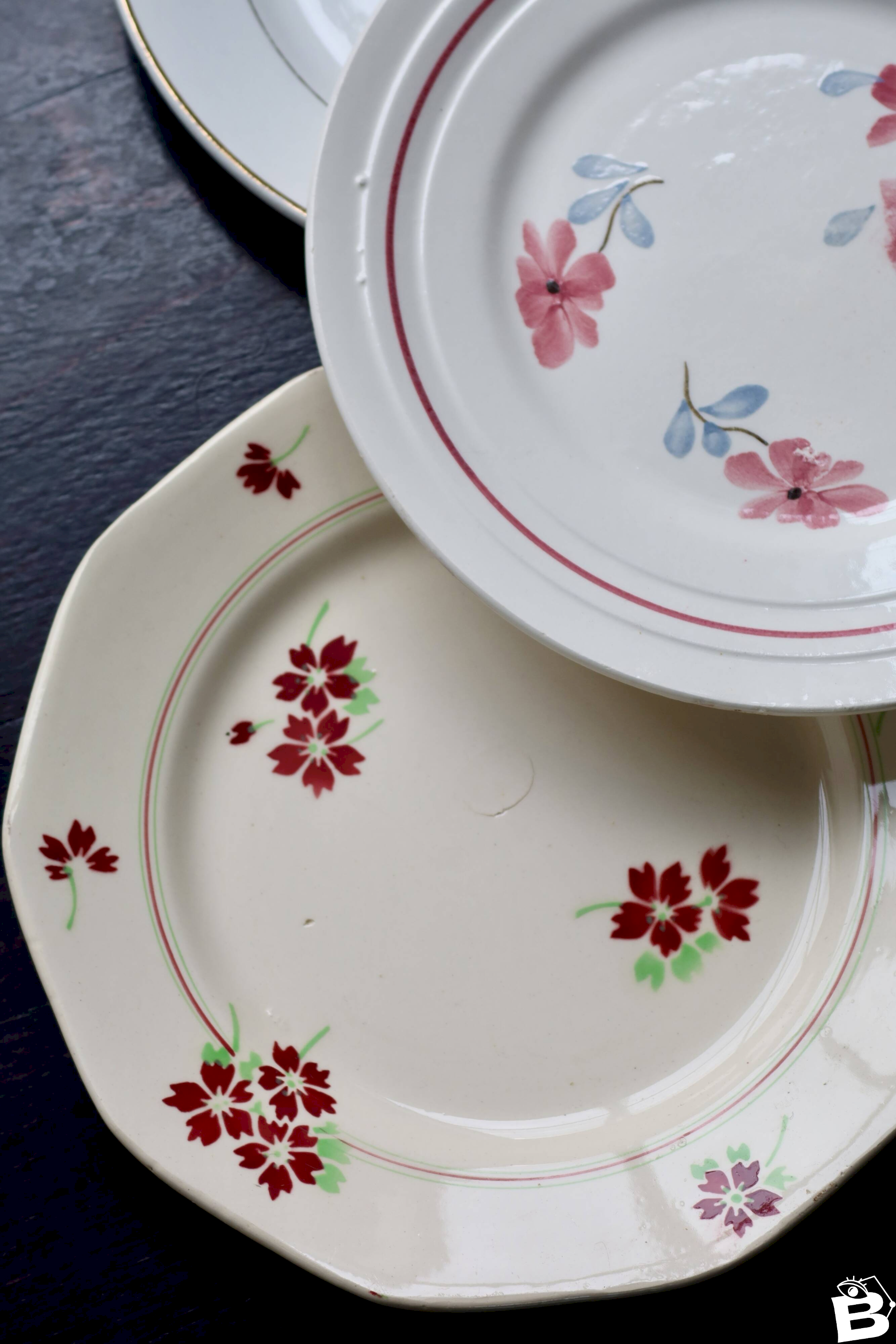 Assiettes à dessert vintage en faïence dépareillées avec motifs rouges