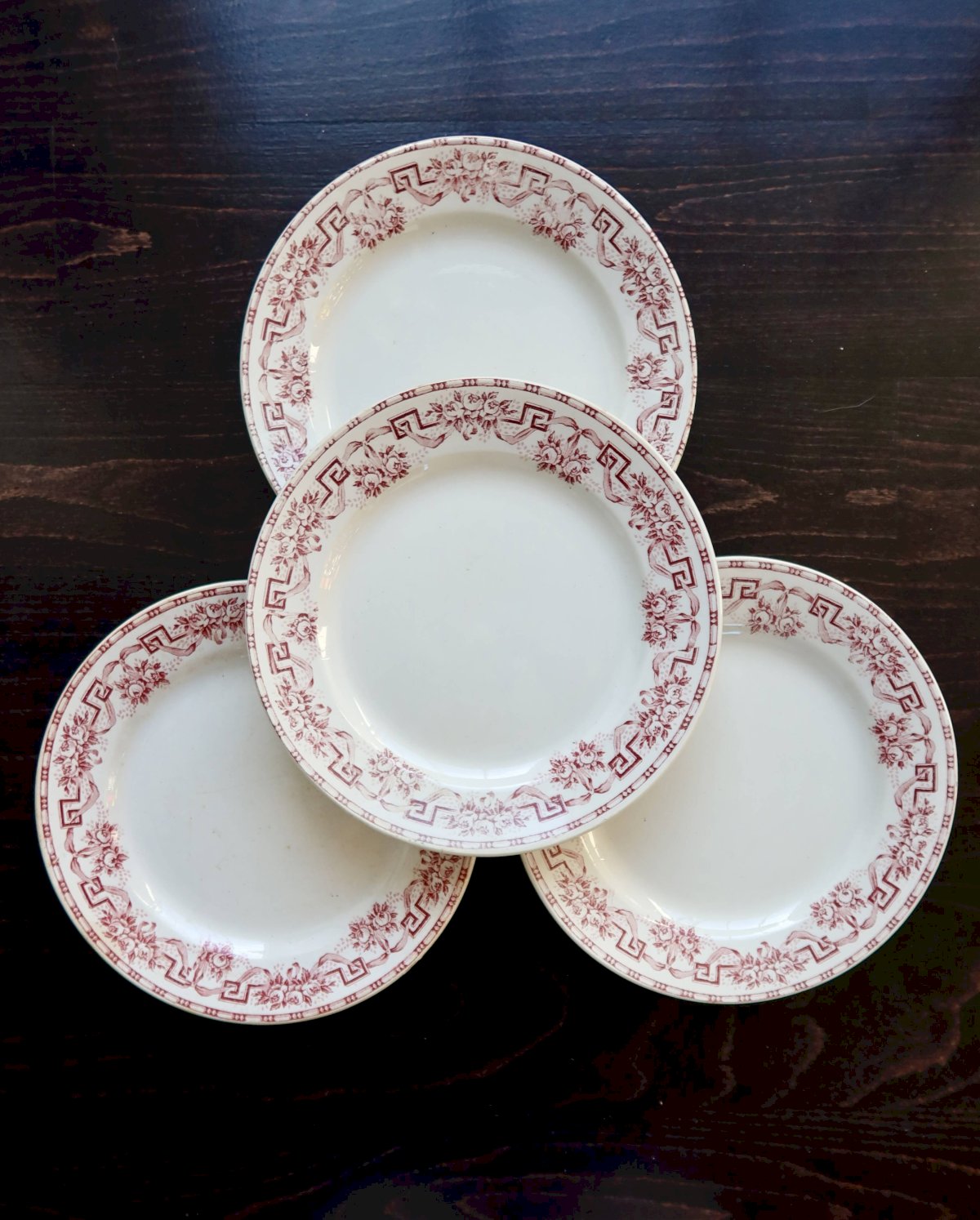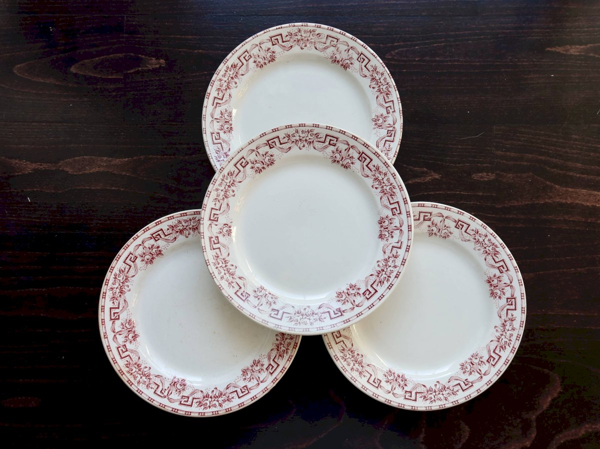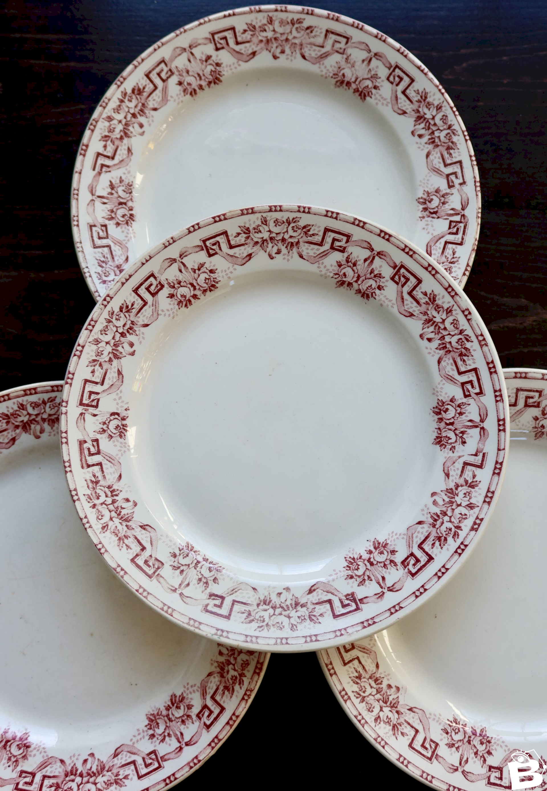 Élégante suite de 4 assiettes plates en terre de fer de la faïencerie française Moulin des Loups, décor Athènes en rouge: frise florale et rubans à motifs grecques sur le marli.Émail bien brillant, rendu chaleureux sur table de campagne.Période: milieu XXe env.Couleurs: rouge carmin sur fond ivoire.État: bel état d’ensemble, traces d’usage cohérentes (micro-rayures, petites taches/petites piqûres et infimes marques sur l’aile, patine régulière).Dimensions: Ø env.
