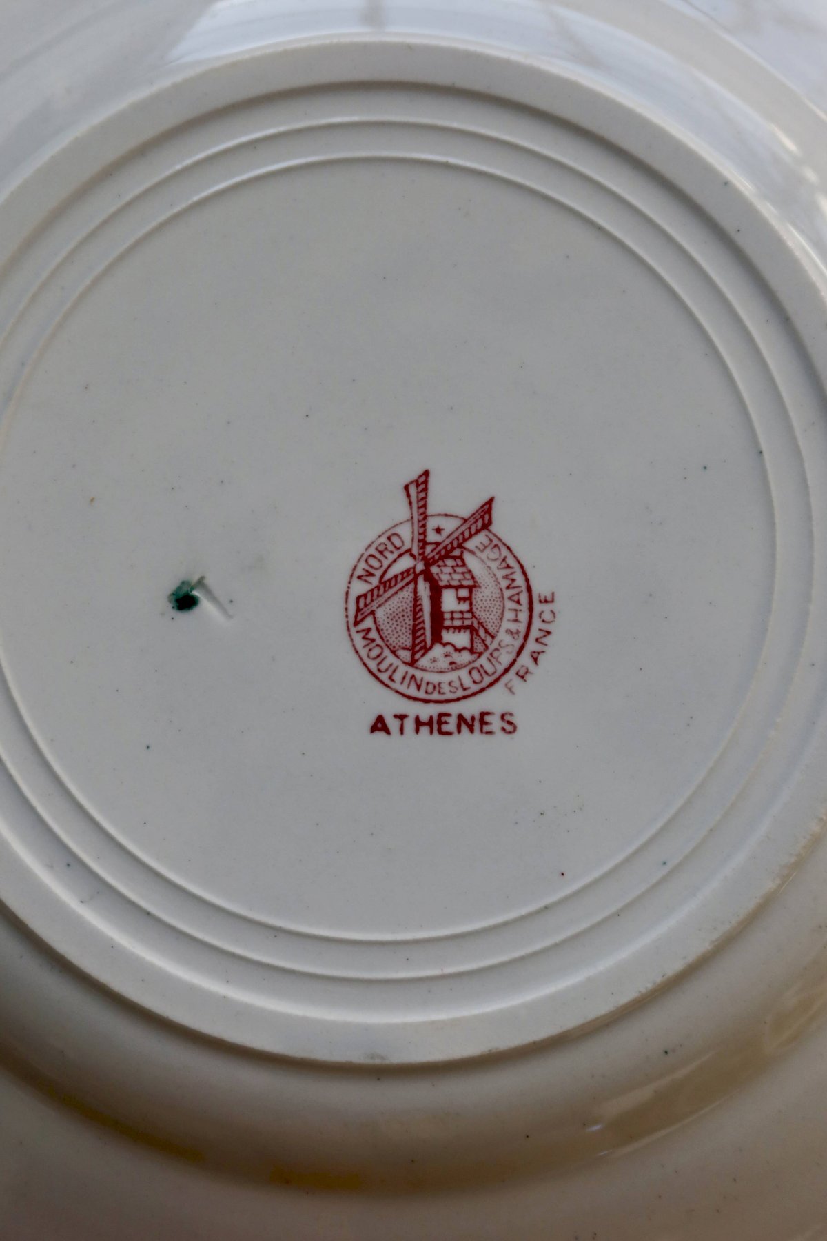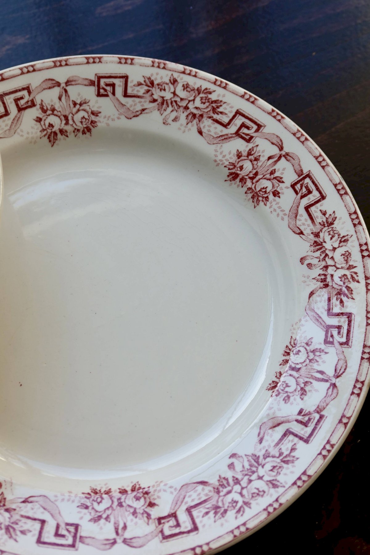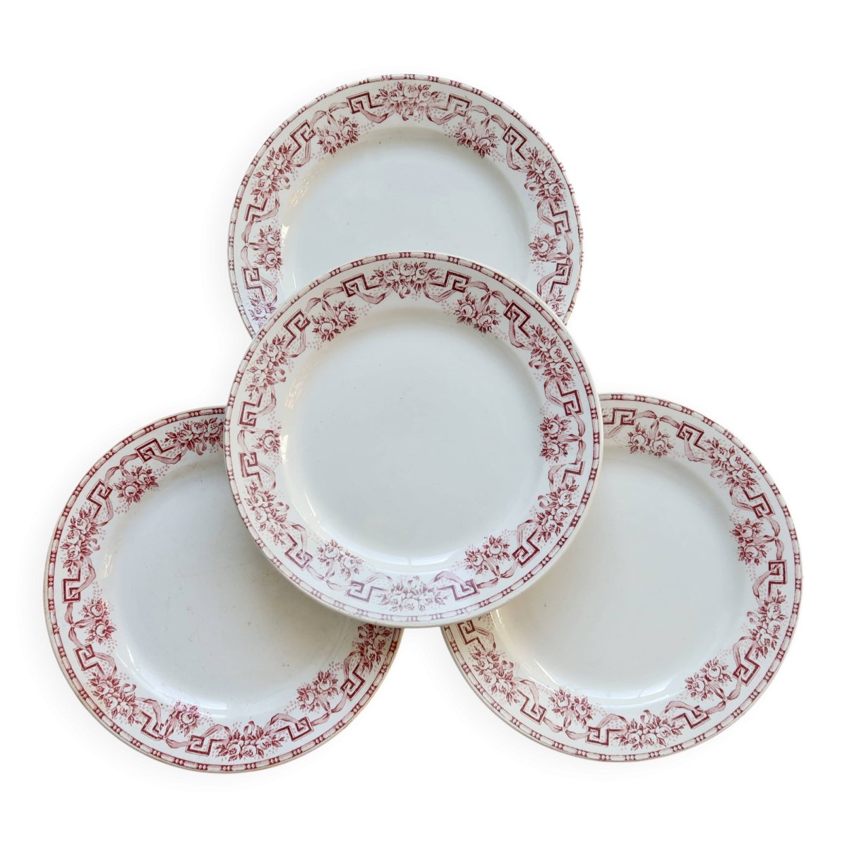 Élégante suite de 4 assiettes plates en terre de fer de la faïencerie française Moulin des Loups, décor Athènes en rouge: frise florale et rubans à motifs grecques sur le marli.Émail bien brillant, rendu chaleureux sur table de campagne.Période: milieu XXe env.Couleurs: rouge carmin sur fond ivoire.État: bel état d’ensemble, traces d’usage cohérentes (micro-rayures, petites taches/petites piqûres et infimes marques sur l’aile, patine régulière).Dimensions: Ø env.