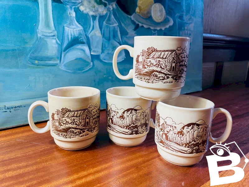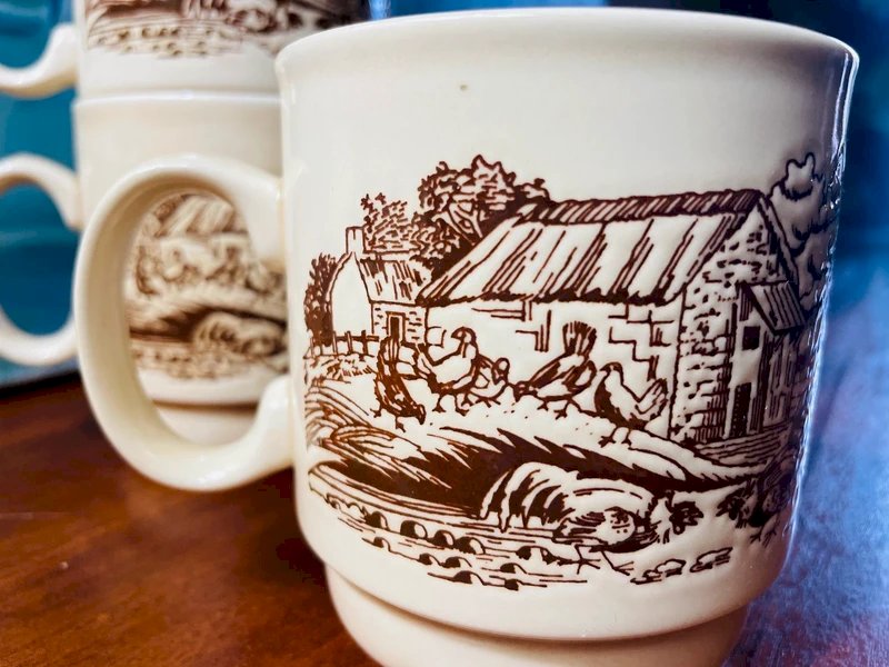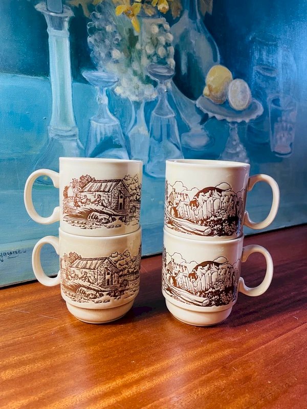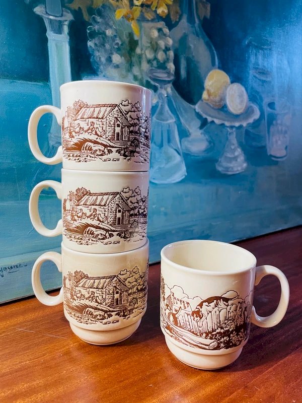 4 mugs vintage et céramique émaillée, décor poules coq et chiens 3 Kilnkraft et un Made in England Très bon état Hauteur 9cm, diamètre 8,3cm