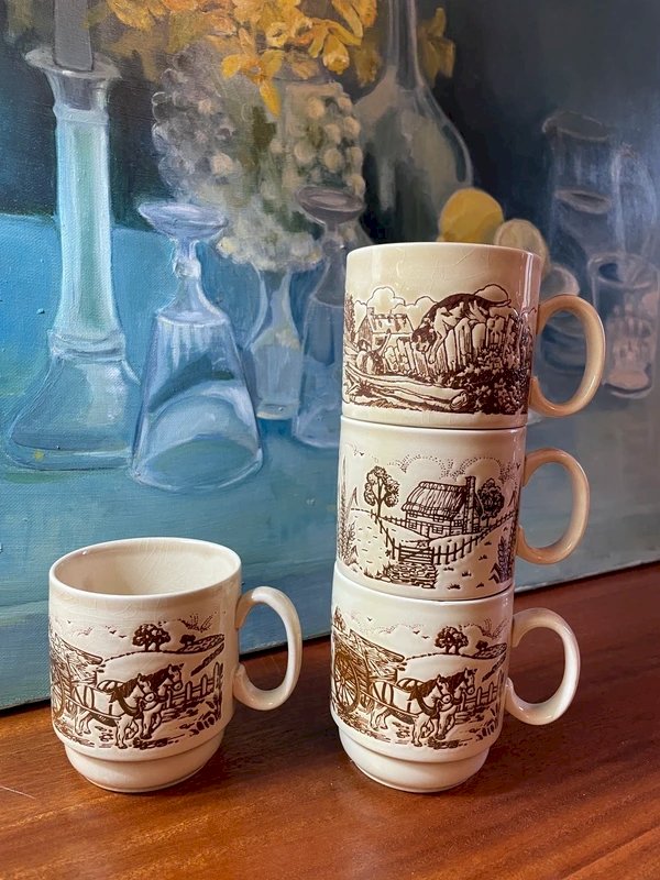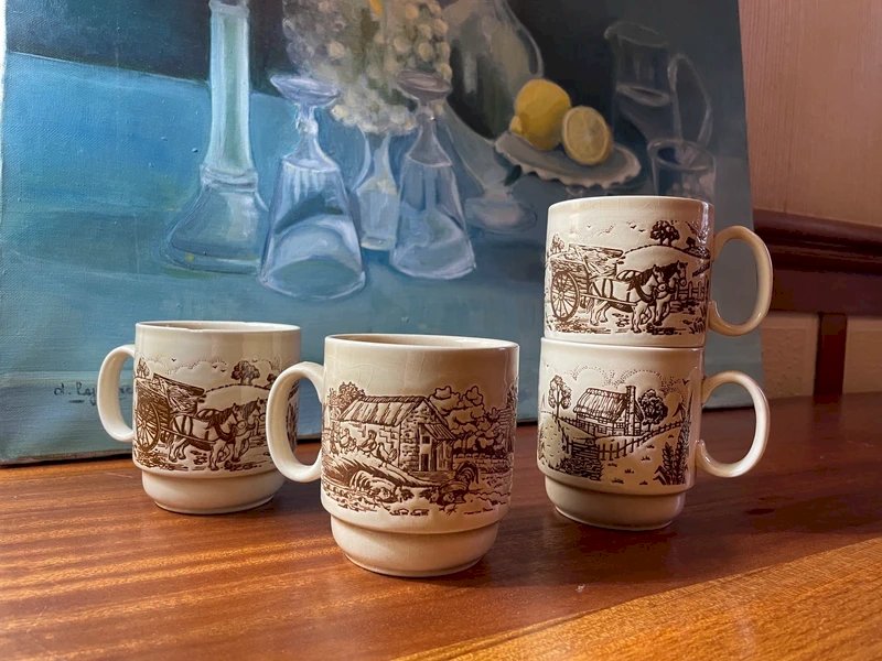 4 mugs vintage et céramique émaillée Made in England 3 décors différents Très bon état (a noter un petit défaut de fabrication à la cuisson sur un mug : photos) Hauteur 9cm, diamètre 8,3cm