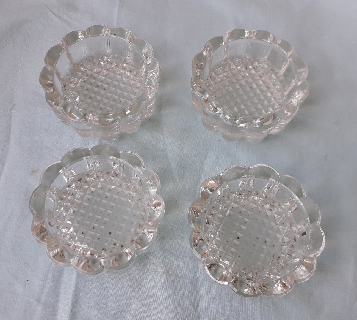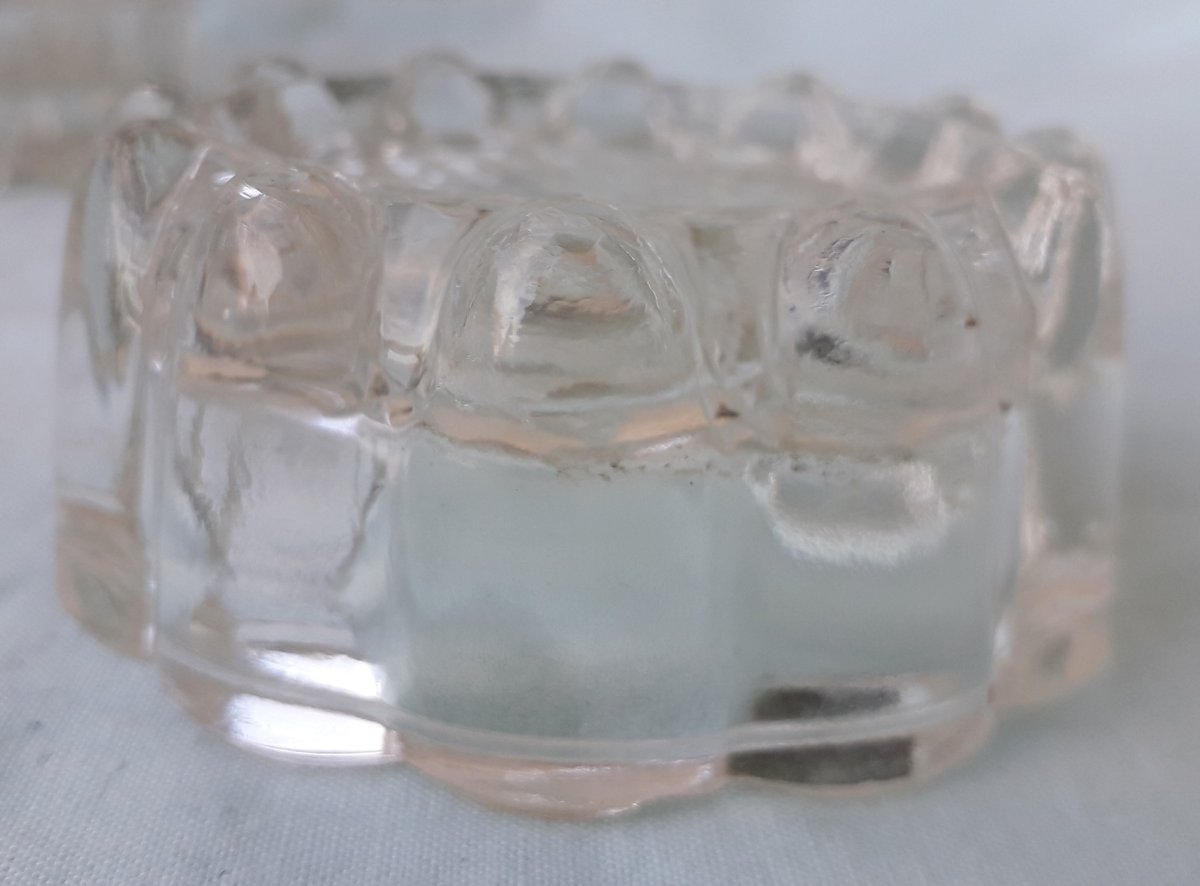 Dimensions : hauteur 3,3 cm, diamètre base 7,5 cm, diamètre intérieur 5 cm. Poids de l'ensemble 0,6 kg.