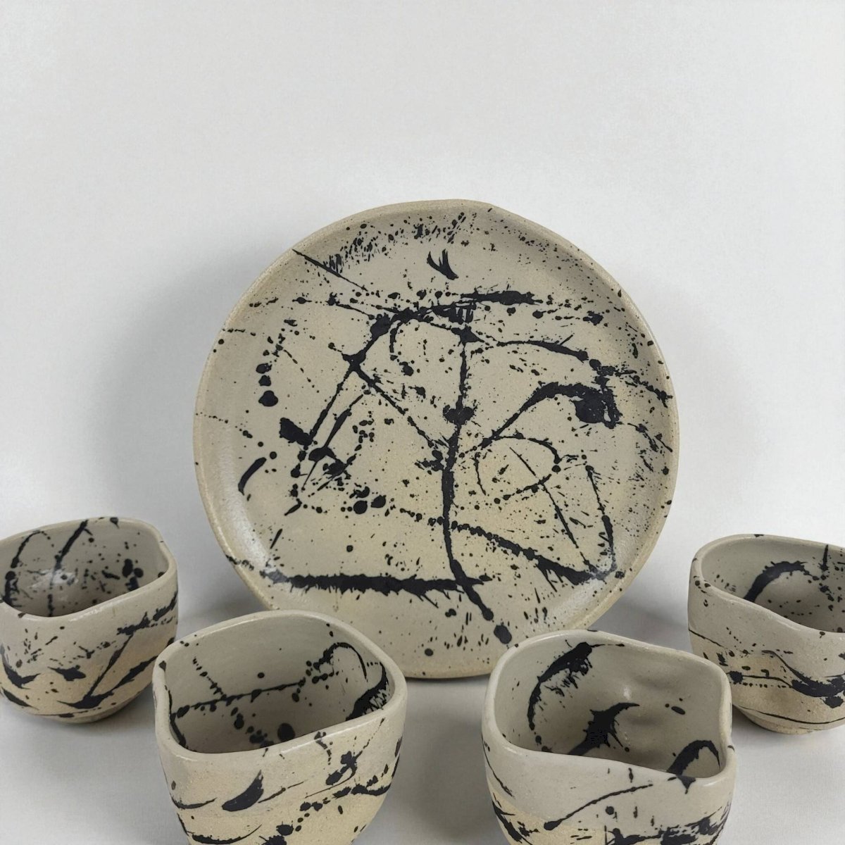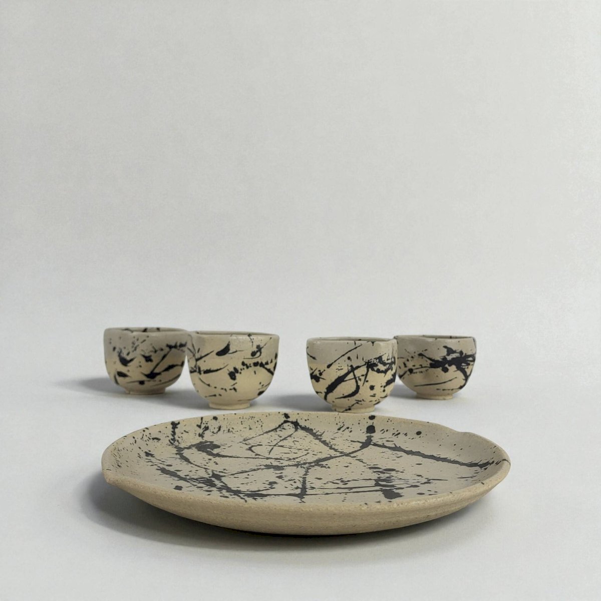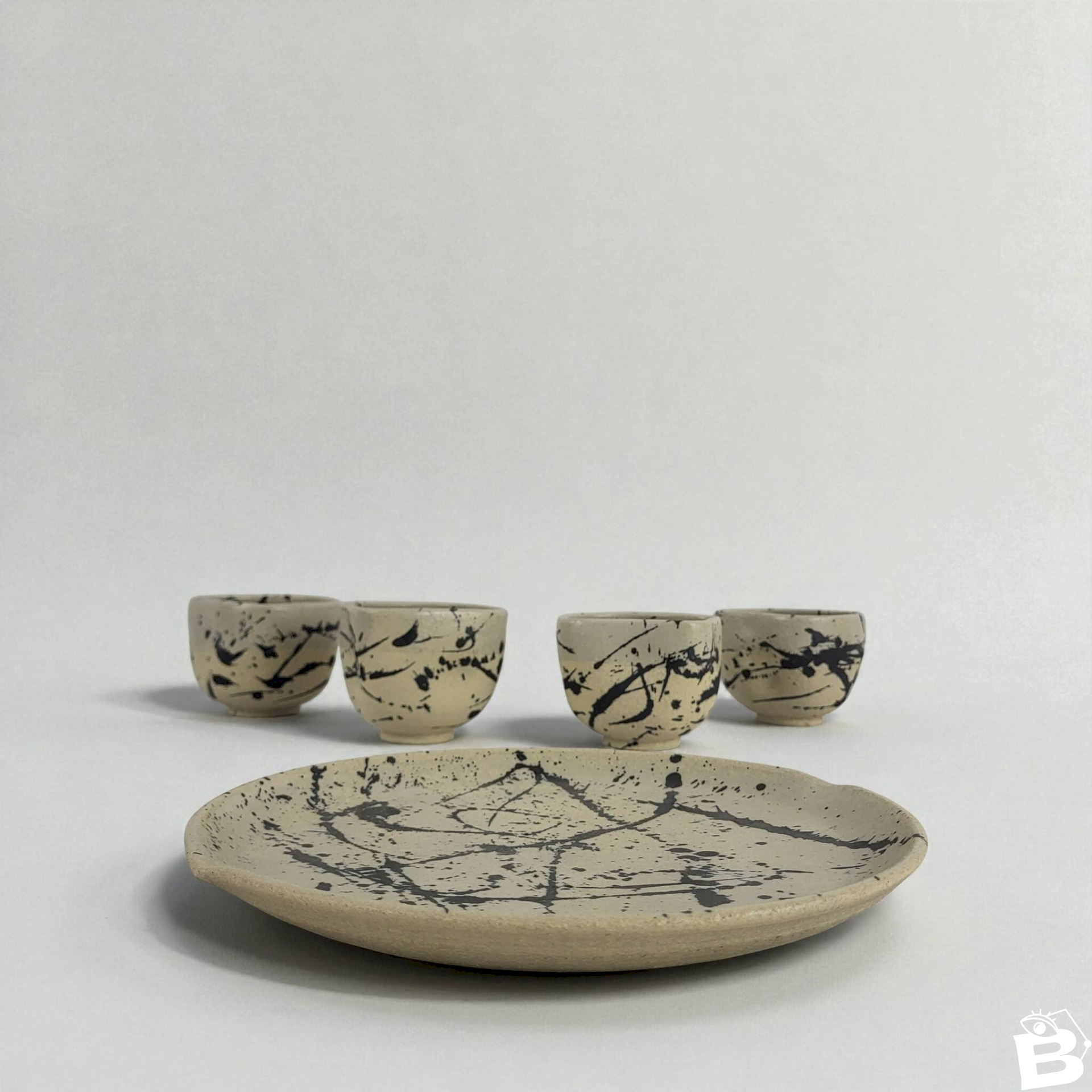Ensemble de 4 tasses en grès reposant sur un plat.Les tasses sont de formes différentes.Hauteur tasses: 6 cm.Diamètre plat 20 cm.En bon état.Emballage soigné et livraison rapide.