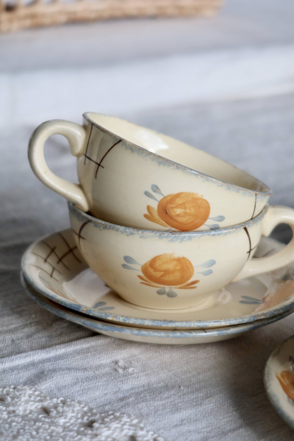 Joli décor peint à la main de fleurs orange et touches bleu gris, bord liseré gris bleuté.Bel état d’ensemble avec petites usures d’émail et de décor compatibles avec l’âge.Possibilité d’acheter uniquement les tasses/sous-tasses ou l’ensemble avec la verseuse assortie.Dimensions:Sous tasse: 15cm.Tasse: 3, 5cm X 10cm.Verseuse: 20cm X 17cm X 13cm.