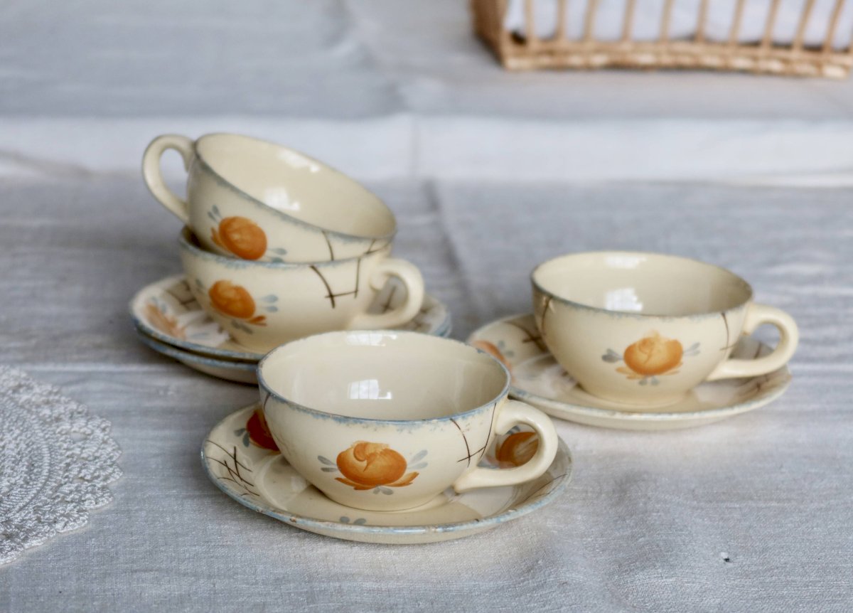 4 tasses à café vintage faïence ivoire et sous-tasses - Motif fleuri Céramique