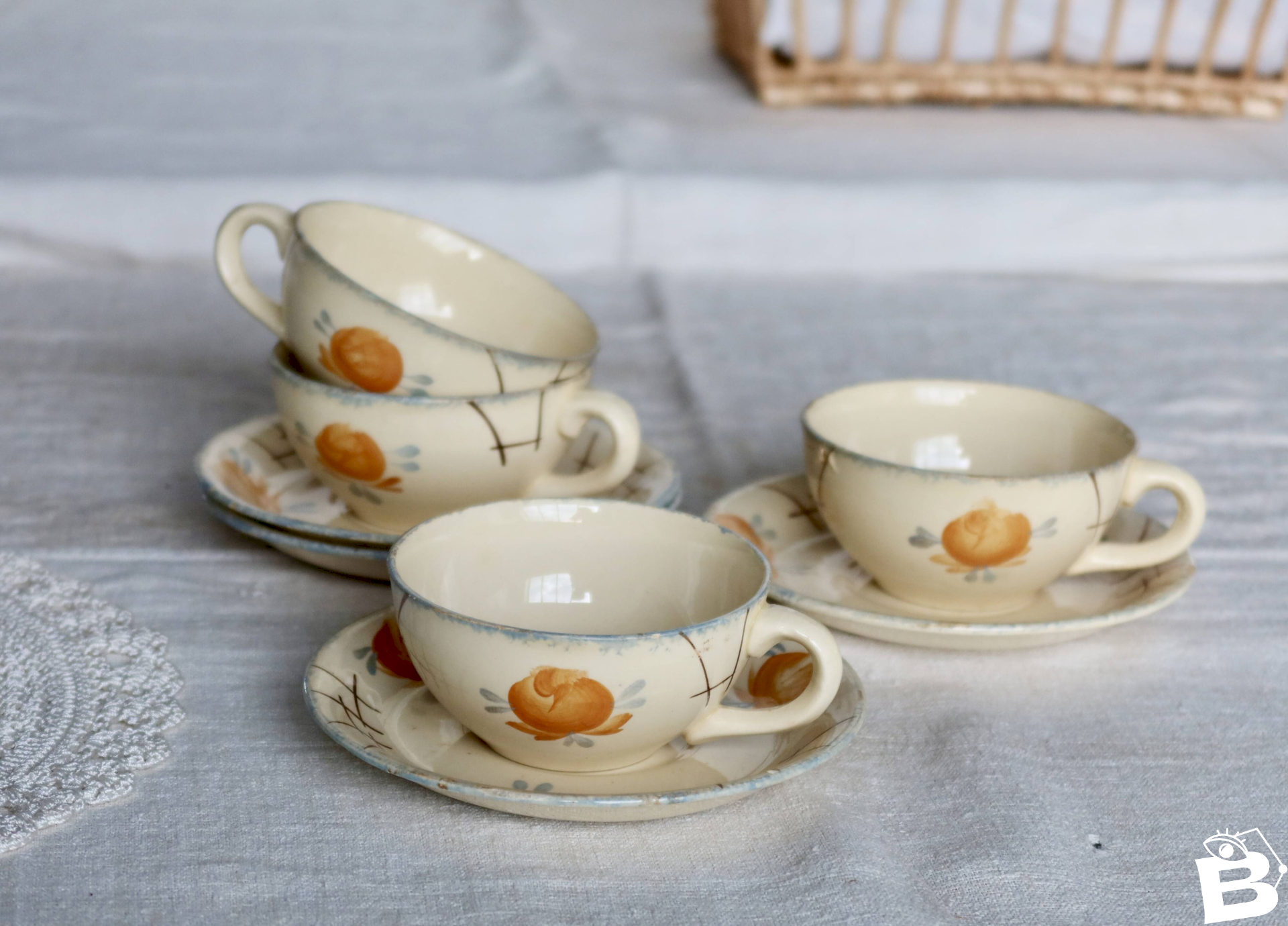 4 tasses à café vintage faïence ivoire et sous-tasses - Motif fleuri
