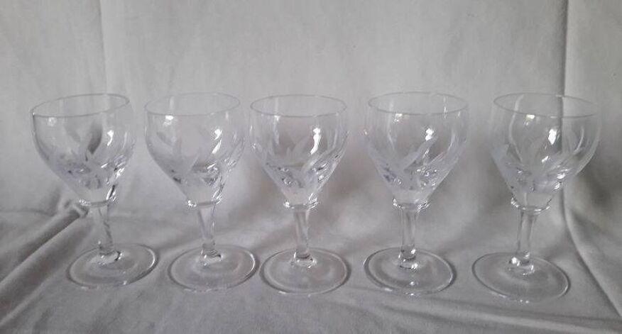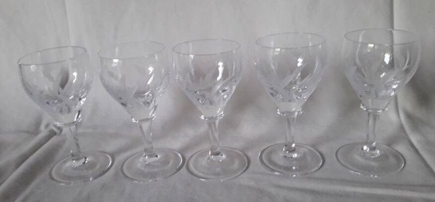Ensemble de 5 verres à pieds en cristal gravé, de 10, 3cm de haut et 5, 3cm de diamètre à la base et 5cm en haut.Très bel état, quelques micro rayures et traces mais vraiment pour être très précise !Ils pèsent entre 75 et 90g pièce.Ref 708-1b.Envoi soigné en colissimo suivi.Pensez à aller voir nos autres produits, et nhésitez pas à nous contacter par message, nous recalculons les frais de transport sur simple demande par message pour un achat multiple!.
