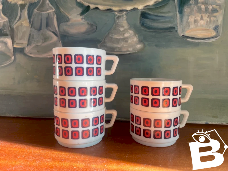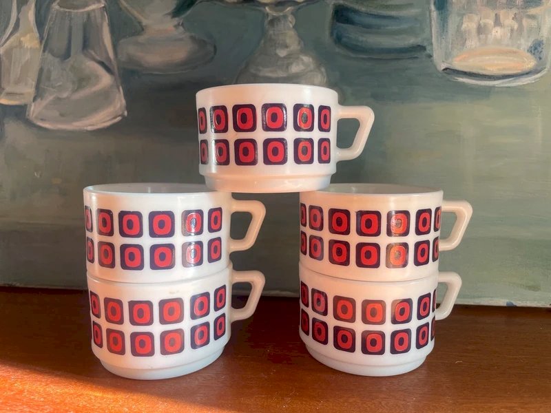 5 tasses vintage en verre opaline blanc Modèle « Square » Très bon état Hauteur 5cm, diamètre 7,5cm