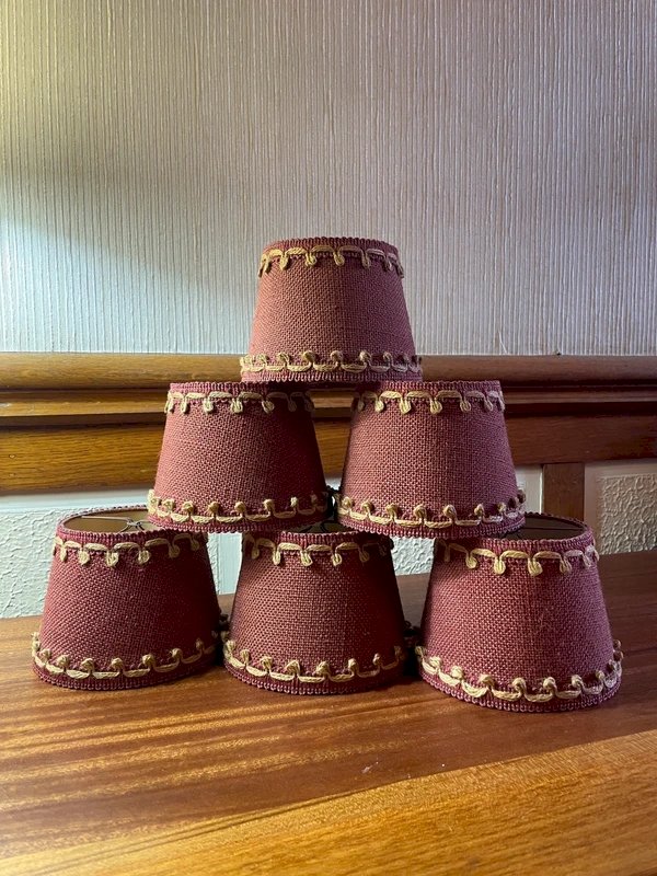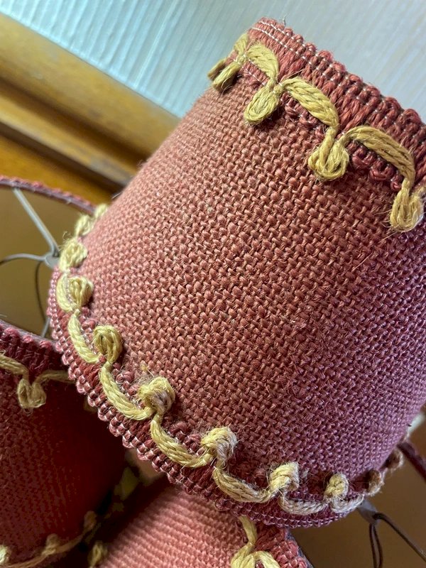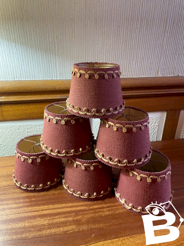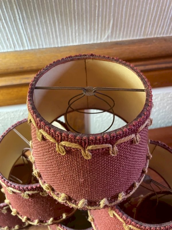6 abat-jours vintage à pince en jute bordeaux et frise couleur naturelle Années 50/60 Hauteur 11cm, diamètre bas 14cm, diamètre haut 10,5cm