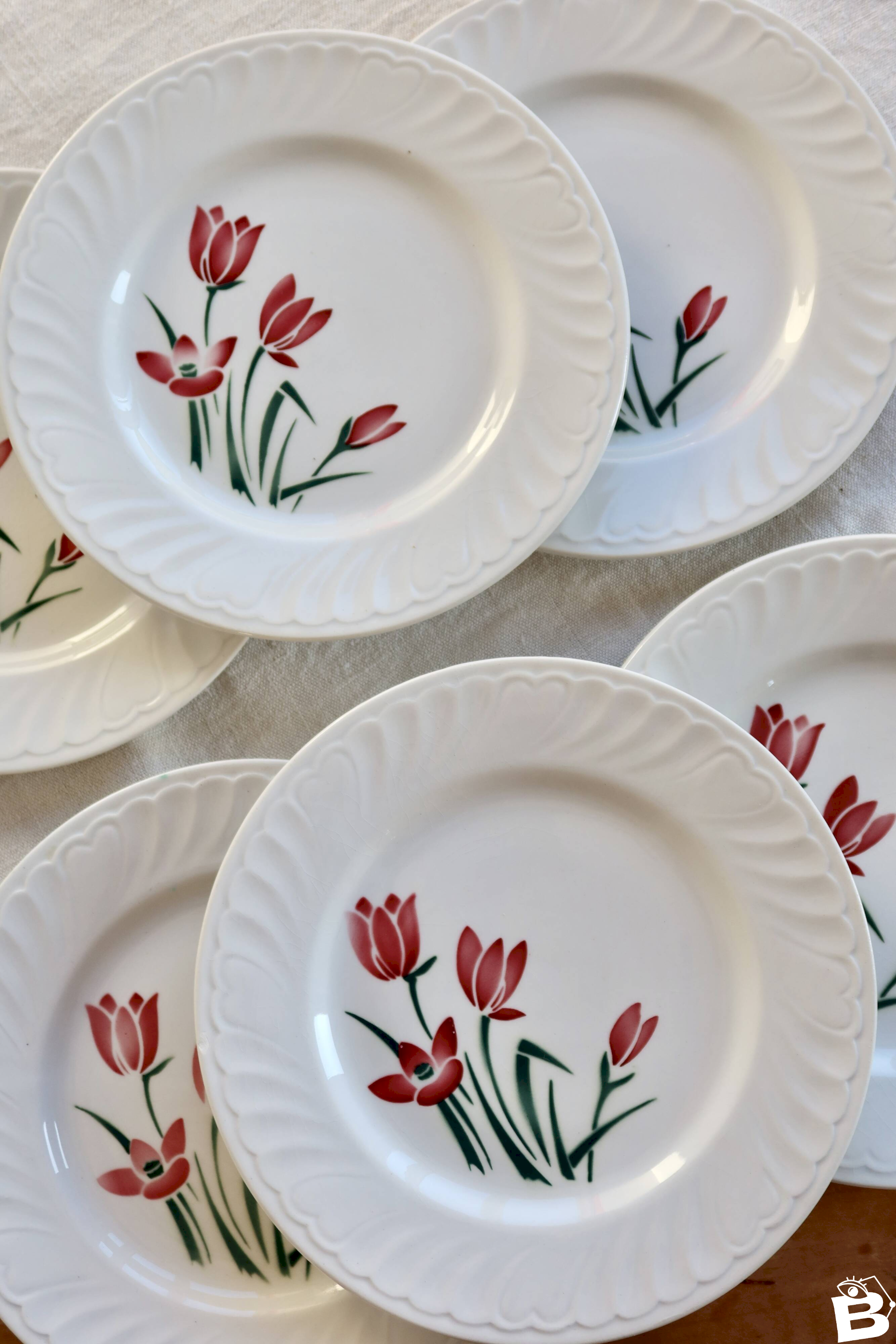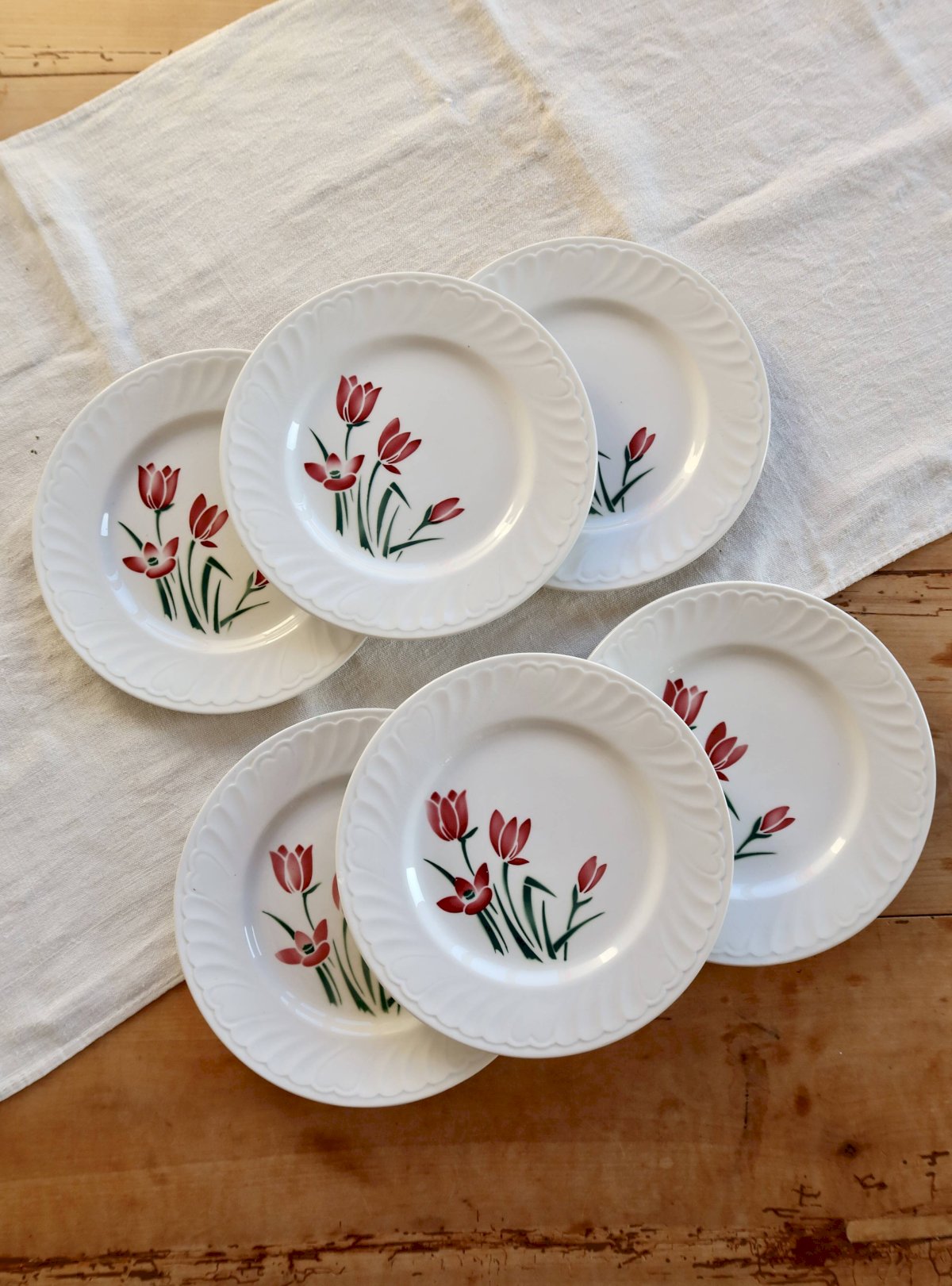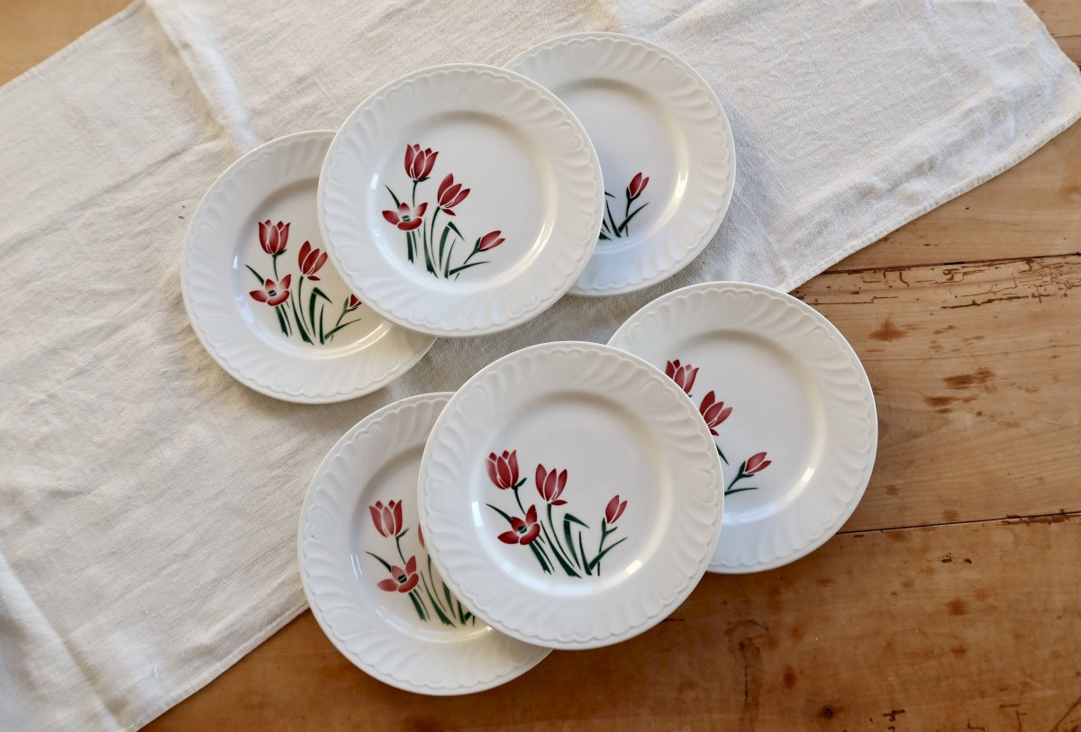 6 assiettes à dessert en faïence blanche de Badonviller, décorées du modèle Crocus avec un motif fleuri rouge et vert au charme printanier.